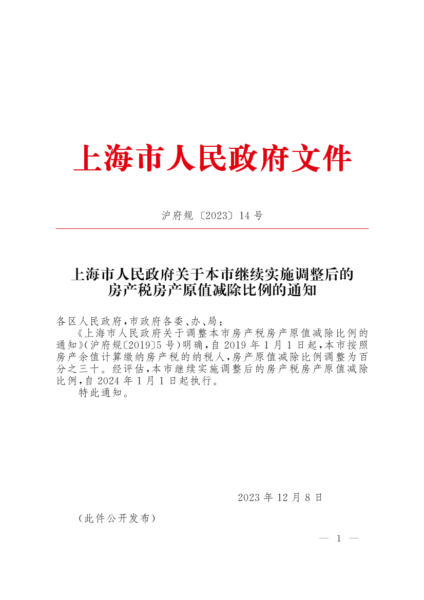 上海市人民政府關(guān)于本市繼續(xù)實(shí)施調(diào)整后的房產(chǎn)稅房產(chǎn)原值減除比例的通知