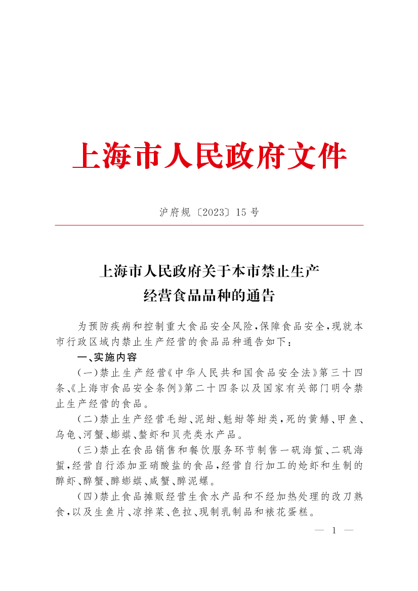 上海市人民政府關(guān)于本市禁止生產(chǎn)經(jīng)營食品品種的通告