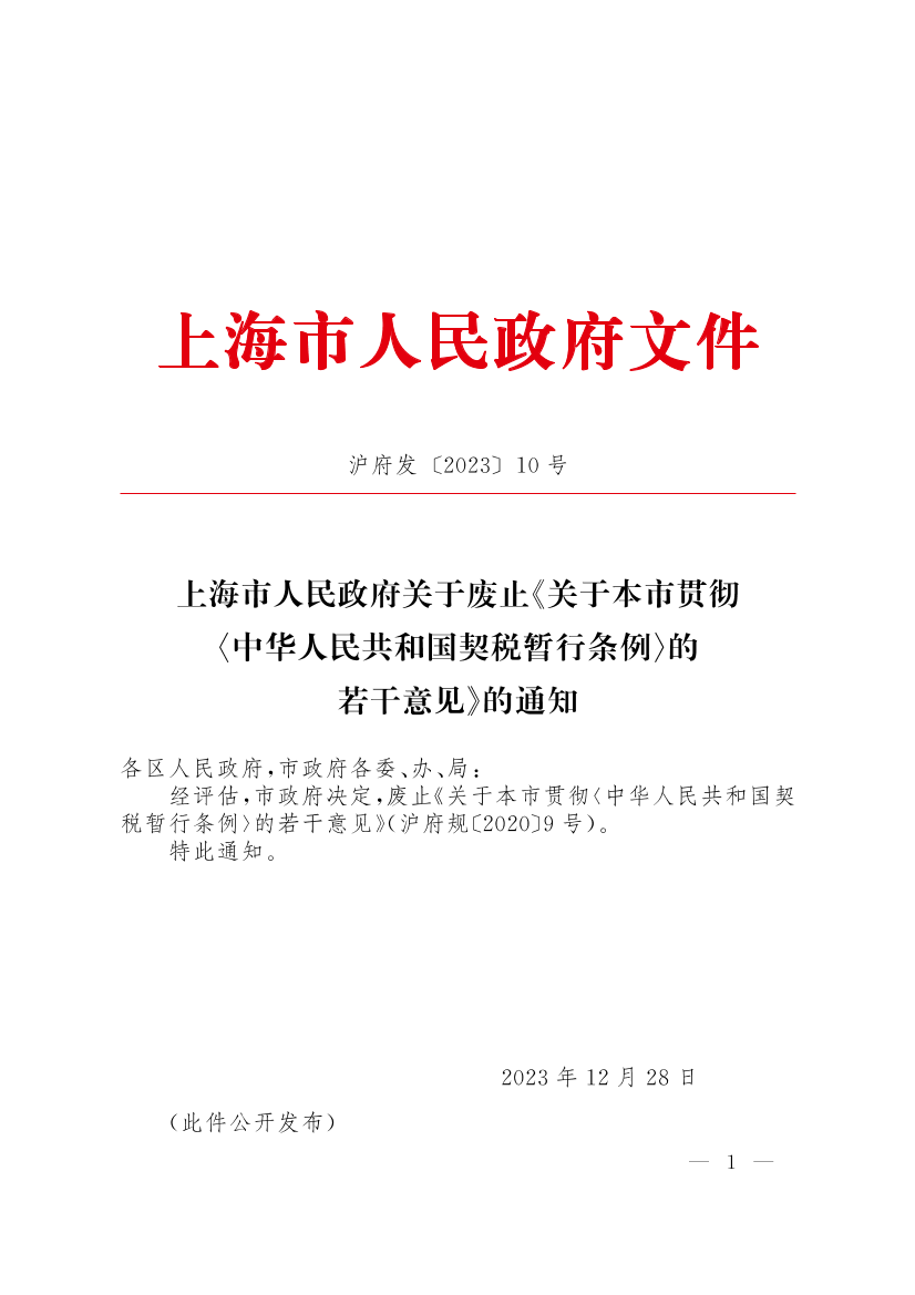 ??經(jīng)評估,市政府決定,廢止《關(guān)于本市貫徹〈中華人民共和國契稅暫行條例〉的若干意見》(滬府規(guī)〔2020〕9號)。