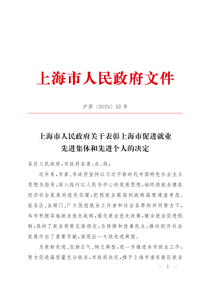 上海市人民政府關(guān)于表彰上海市促進(jìn)就業(yè)先進(jìn)集體和先進(jìn)個人的決定