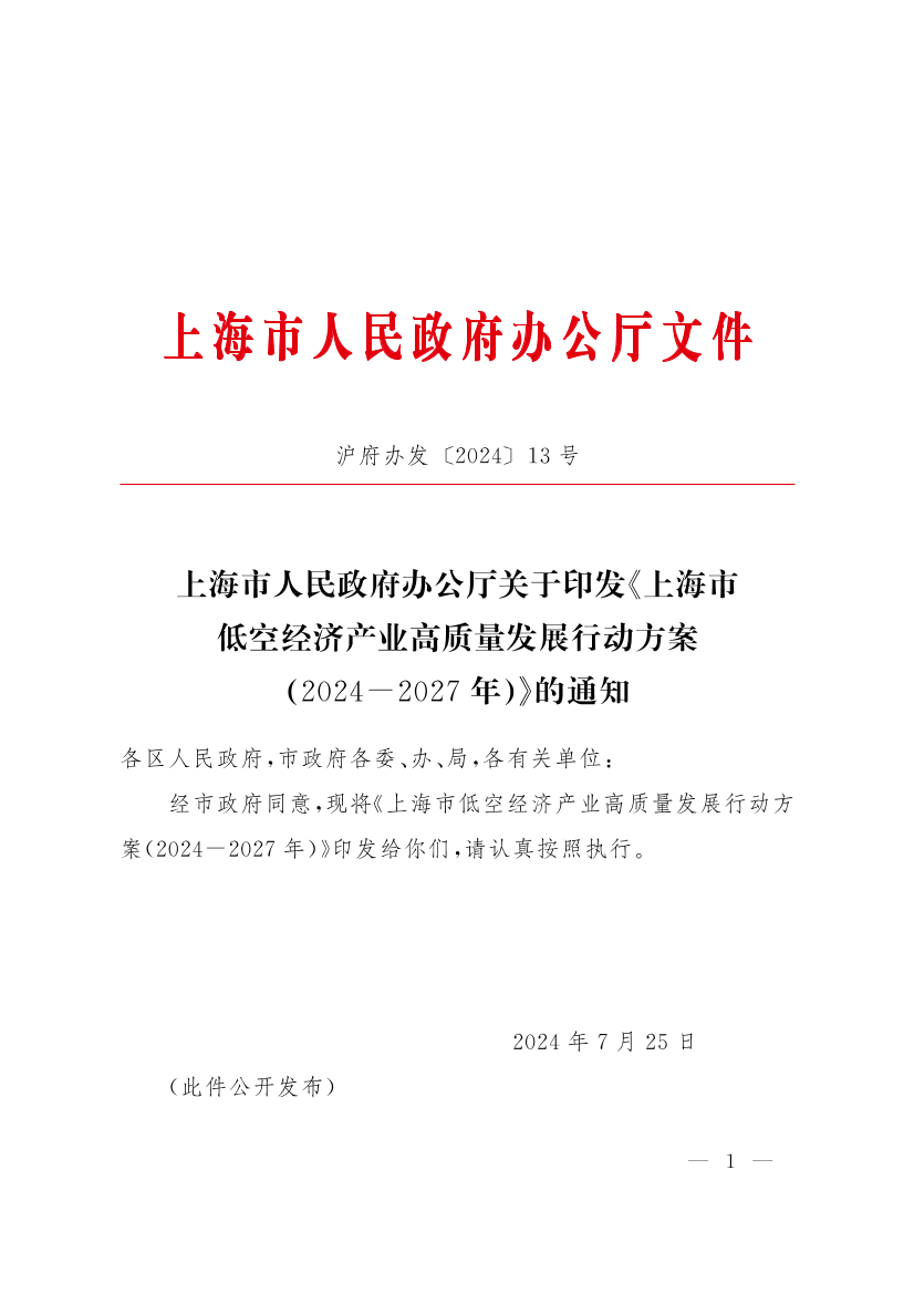 上海市人民政府辦公廳關于印發(fā)《上海市低空經(jīng)濟產(chǎn)業(yè)高質量發(fā)展行動方案(2024-2027年)》的通知