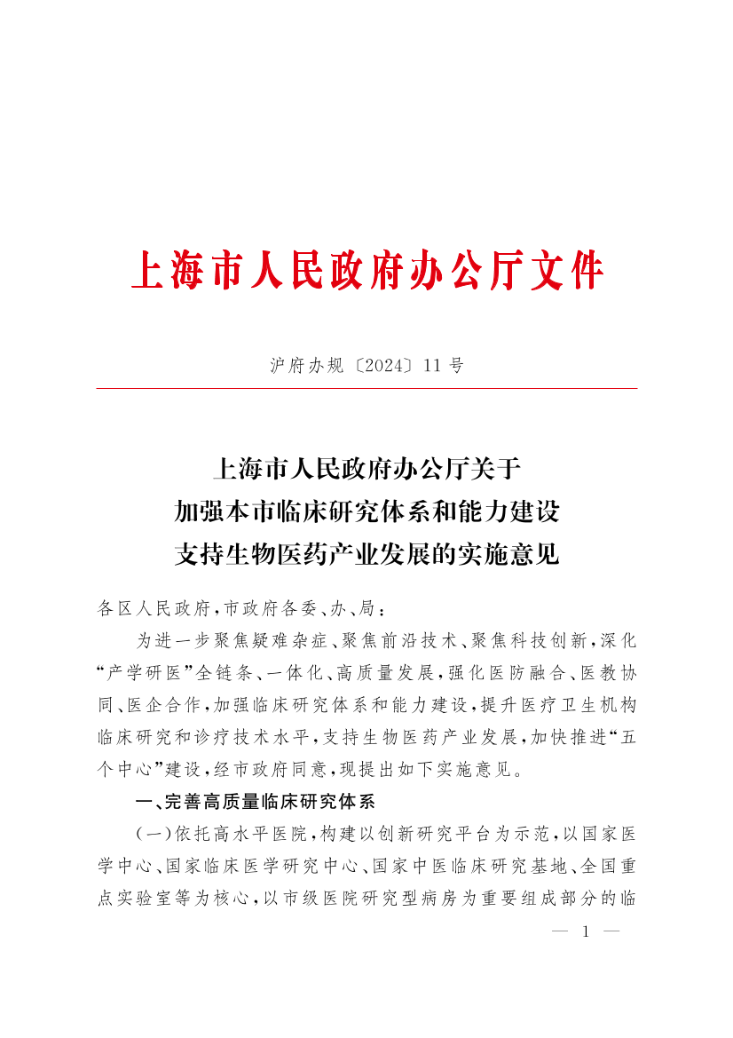 上海市人民政府辦公廳關(guān)于加強(qiáng)本市臨床研究體系和能力建設(shè)支持生物醫(yī)藥產(chǎn)業(yè)發(fā)展的實(shí)施意見