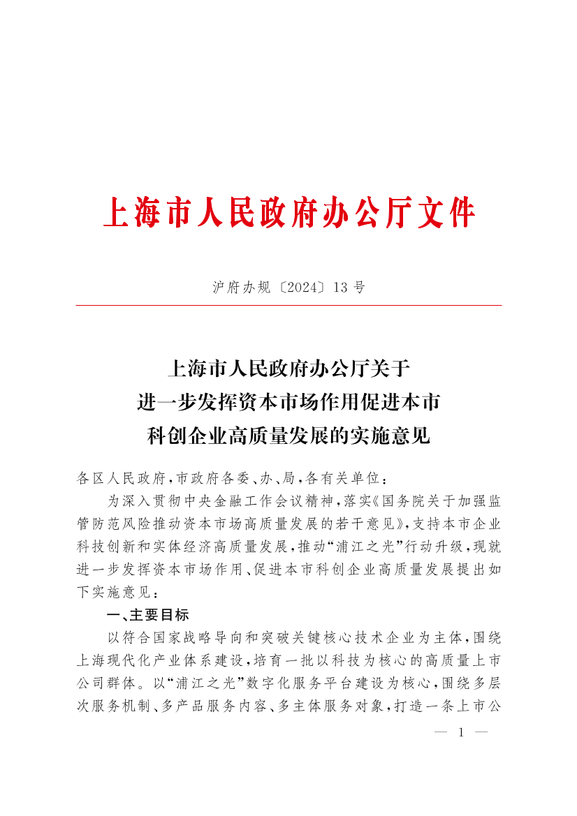 ??為深入貫徹中央金融工作會議精神,落實《國務(wù)院關(guān)于加強監(jiān)管防范風險推動資本市場高質(zhì)量發(fā)展的若干意見》,支持本市企業(yè)科技創(chuàng)新和實體經(jīng)濟高質(zhì)量發(fā)展,推動“浦江之光”行動升級,現(xiàn)就進一步發(fā)揮資本市場作用、促進本市科創(chuàng)企業(yè)高質(zhì)量發(fā)展提出如下實施意見: