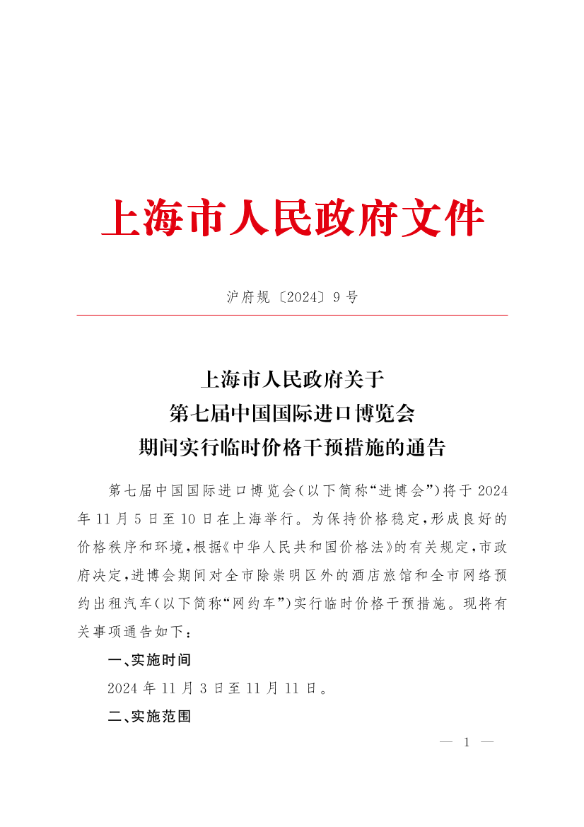 第七屆中國國際進口博覽會(以下簡稱“進博會”)將于2024年11月5日至10日在上海舉行。為保持價格穩(wěn)定,形成良好的價格秩序和環(huán)境,根據(jù)《中華人民共和國價格法》的有關(guān)規(guī)定,市政府決定,進博會期間對全市除崇明區(qū)外的酒店旅館和全市網(wǎng)絡(luò)預(yù)約出租汽車(以下簡稱“網(wǎng)約車”)實行臨時價格干預(yù)措施?,F(xiàn)將有關(guān)事項通告如下: