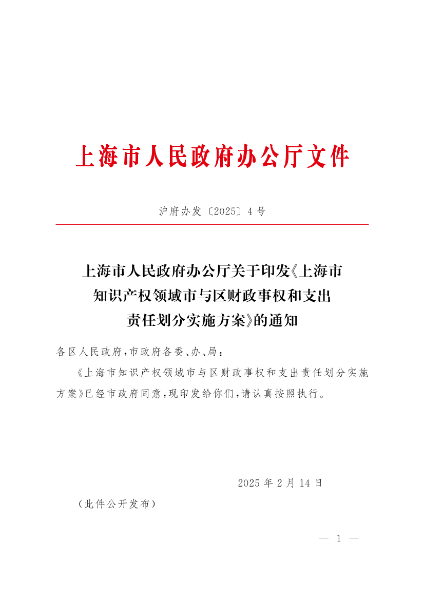 ??《上海市知識產(chǎn)權領域市與區(qū)財政事權和支出責任劃分實施方案》已經(jīng)市政府同意,現(xiàn)印發(fā)給你們,請認真按照執(zhí)行。