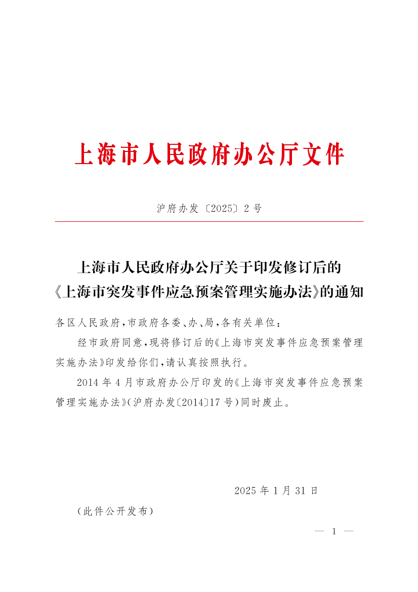 ??2014年4月市政府辦公廳印發(fā)的《上海市突發(fā)事件應(yīng)急預(yù)案管理實(shí)施辦法》(滬府辦發(fā)〔2014〕17號)同時廢止。