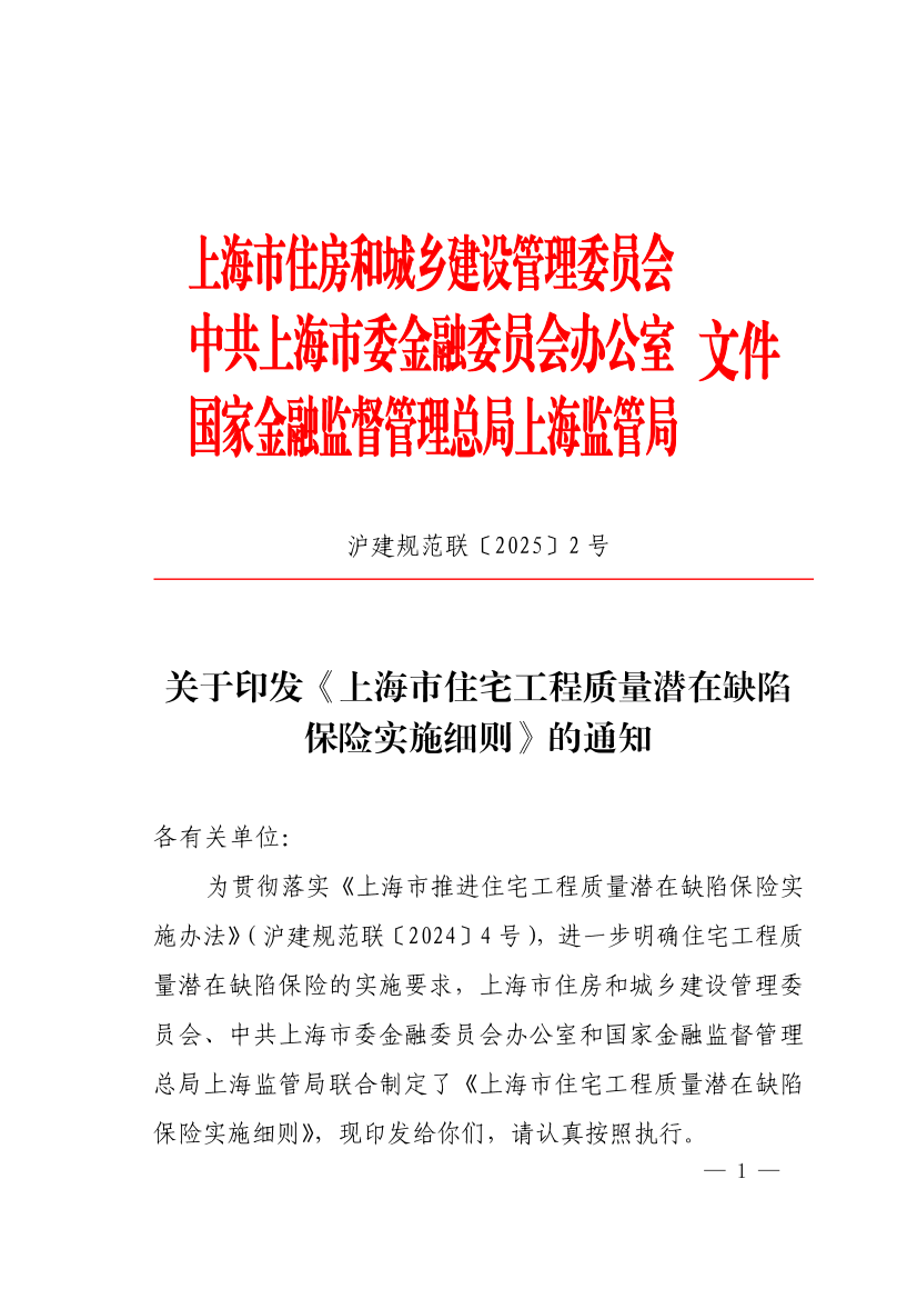 ??為貫徹落實《上海市推進住宅工程質(zhì)量潛在缺陷保險實施辦法》(滬建規(guī)范聯(lián)〔2024〕4號),進一步明確住宅工程質(zhì)量潛在缺陷保險的實施要求,上海市住房和城鄉(xiāng)建設(shè)管理委員會、中共上海市委金融委員會辦公室和國家金融監(jiān)督管理總局上海監(jiān)管局聯(lián)合制定了《上海市住宅工程質(zhì)量潛在缺陷保險實施細(xì)則》,現(xiàn)印發(fā)給你們,請認(rèn)真按照執(zhí)行。