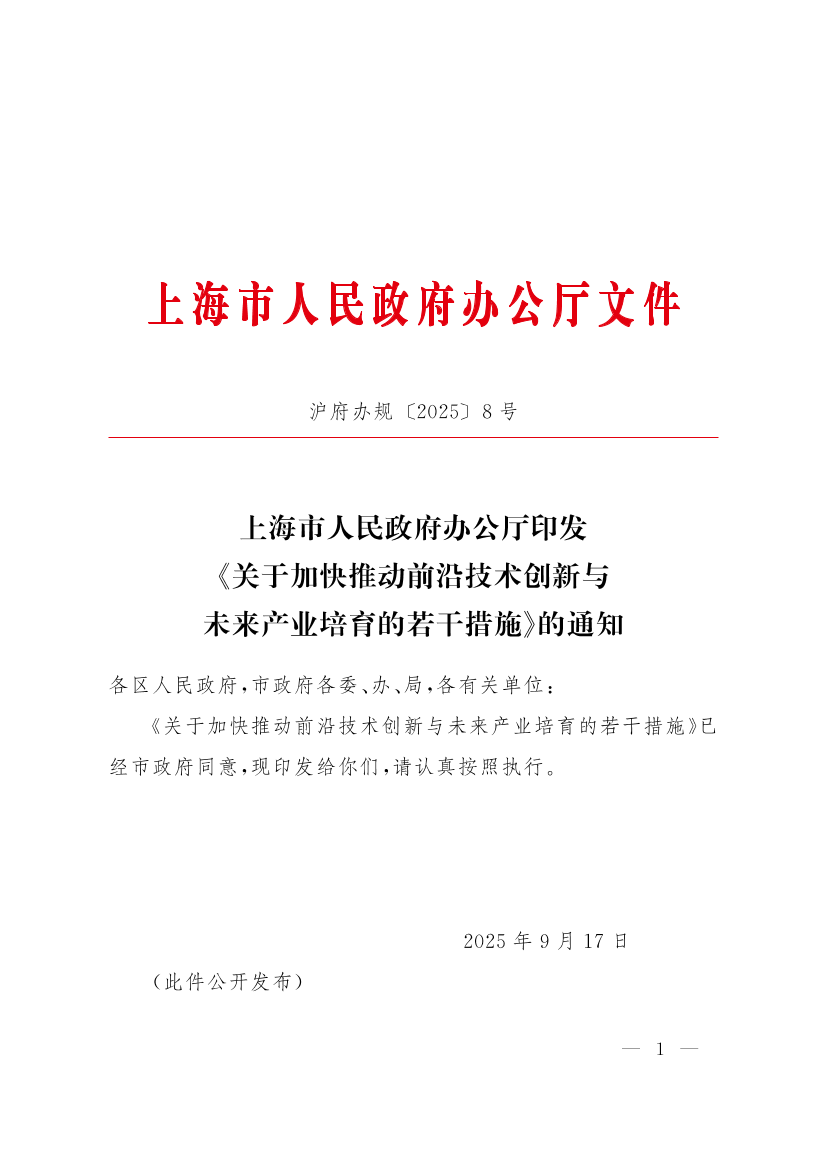 上海市人民政府辦公廳印發(fā)《關(guān)于加快推動(dòng)前沿技術(shù)創(chuàng)新與未來(lái)產(chǎn)業(yè)培育的若干措施》的通知