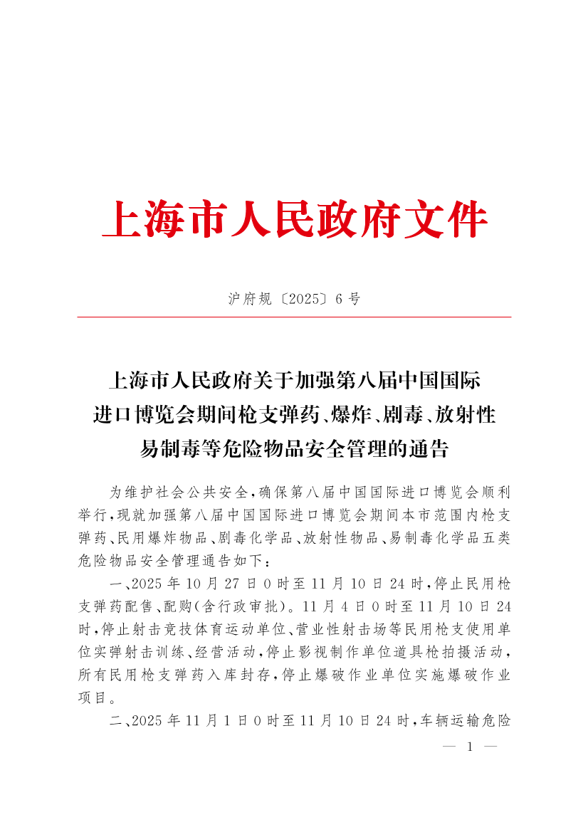上海市人民政府關(guān)于加強(qiáng)第八屆中國國際進(jìn)口博覽會(huì)期間槍支彈藥、爆炸、劇毒、放射性、易制毒等危險(xiǎn)物品安全管理的通告