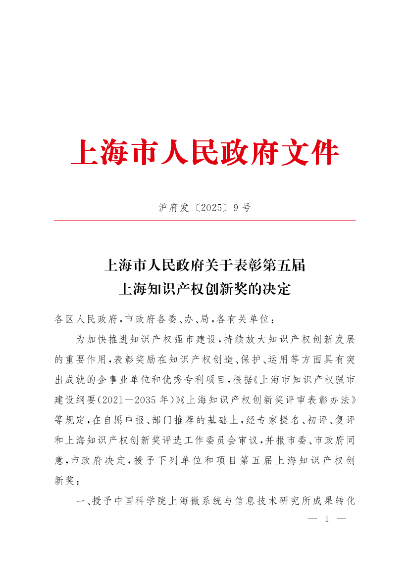 ??為加快推進知識產(chǎn)權(quán)強市建設(shè),持續(xù)放大知識產(chǎn)權(quán)創(chuàng)新發(fā)展的重要作用,表彰獎勵在知識產(chǎn)權(quán)創(chuàng)造、保護、運用等方面具有突出成就的企事業(yè)單位和優(yōu)秀專利項目,根據(jù)《上海市知識產(chǎn)權(quán)強市建設(shè)綱要(2021-2035年)》《上海知識產(chǎn)權(quán)創(chuàng)新獎評審表彰辦法》等規(guī)定,在自愿申報、部門推薦的基礎(chǔ)上,經(jīng)專家提名、初評、復評和上海知識產(chǎn)權(quán)創(chuàng)新獎評選工作委員會審議,并報市委、市政府同意,市政府決定,授予下列單位和項目第五屆上海知識產(chǎn)權(quán)創(chuàng)新獎: