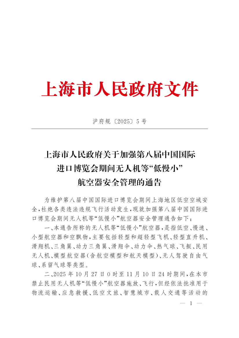 上海市人民政府關(guān)于加強第八屆中國國際進口博覽會期間無人機等“低慢小”航空器安全管理的通告