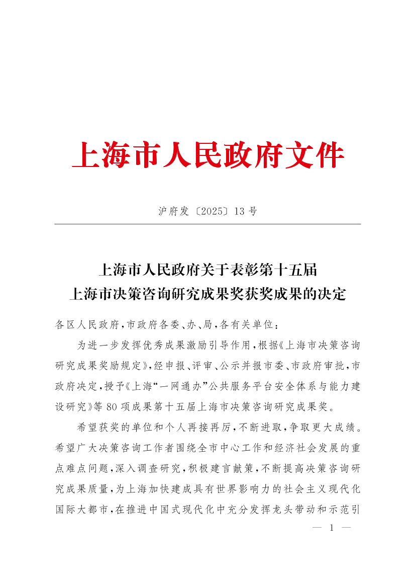 ??為進(jìn)一步發(fā)揮優(yōu)秀成果激勵(lì)引導(dǎo)作用,根據(jù)《上海市決策咨詢研究成果獎(jiǎng)勵(lì)規(guī)定》,經(jīng)申報(bào)、評(píng)審、公示并報(bào)市委、市政府審批,市政府決定,授予《上海“一網(wǎng)通辦”公共服務(wù)平臺(tái)安全體系與能力建設(shè)研究》等80項(xiàng)成果第十五屆上海市決策咨詢研究成果獎(jiǎng)。