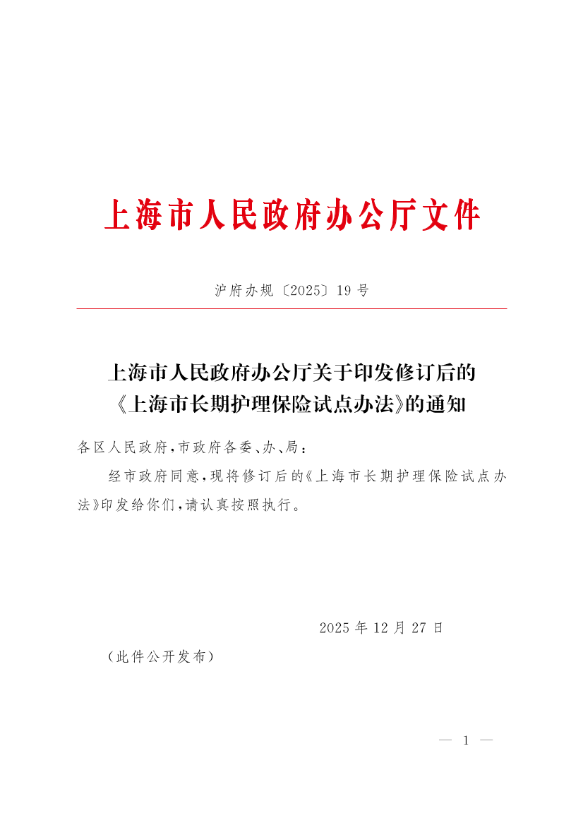 上海市人民政府辦公廳關于印發(fā)修訂后的《上海市長期護理保險試點辦法》的通知