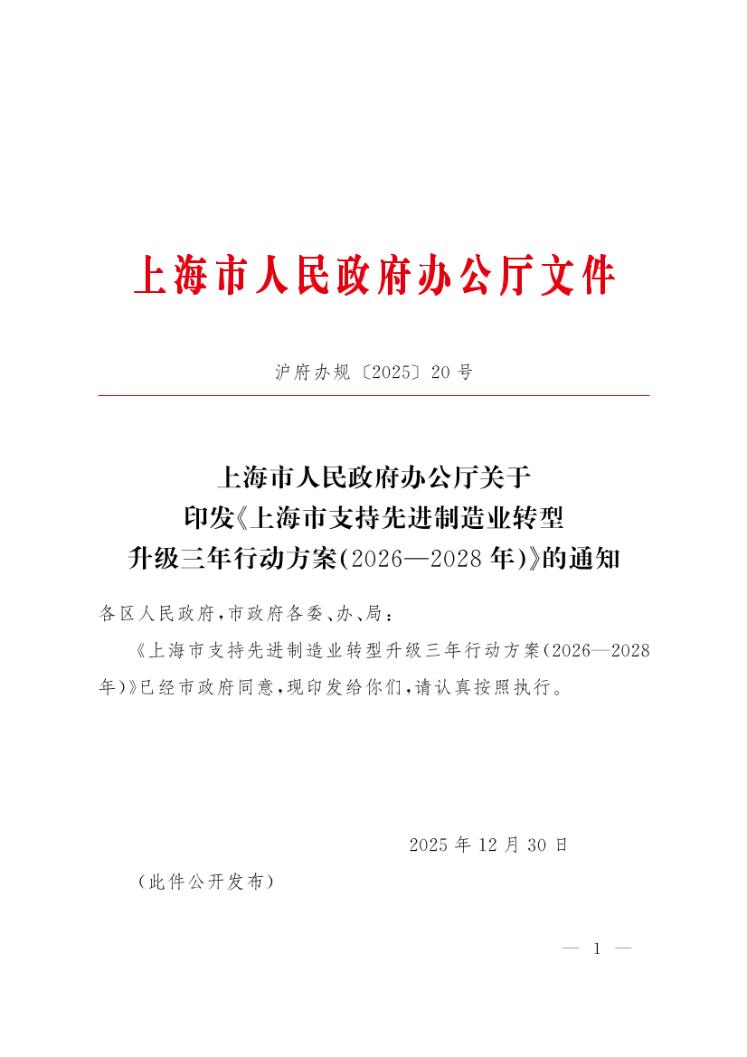 ??《上海市支持先進(jìn)制造業(yè)轉(zhuǎn)型升級三年行動(dòng)方案(2026—2028年)》已經(jīng)市政府同意,現(xiàn)印發(fā)給你們,請認(rèn)真按照執(zhí)行。