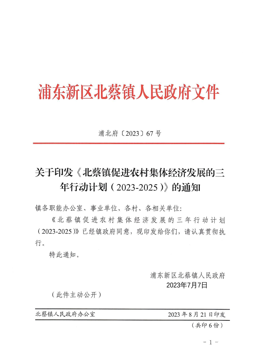 ??《北蔡鎮(zhèn)促進農(nóng)村集體經(jīng)濟發(fā)展的三年行動計劃(2023-2025)》已經(jīng)鎮(zhèn)政府同意,現(xiàn)印發(fā)給你們,請認(rèn)真貫徹執(zhí)行。