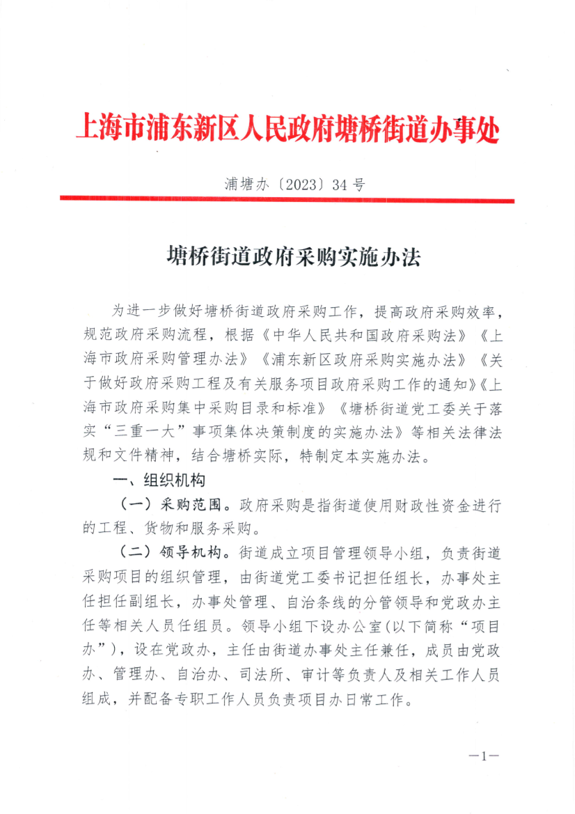 ??為進一步做好塘橋街道政府采購工作,提高政府采購效率,規(guī)范政府采購流程,根據(jù)《中華人民共和國政府采購法》《上海市政府采購管理辦法》《浦東新區(qū)政府采購實施辦法》《關于做好政府采購工程及有關服務項目政府采購工作的通知》《上海市政府采購集中采購目錄和標準》《塘橋街道黨工委關于落實“三重一大”事項集體決策制度的實施辦法》等相關法律法規(guī)和文件精神,結合塘橋實際,特制定本實施辦法。