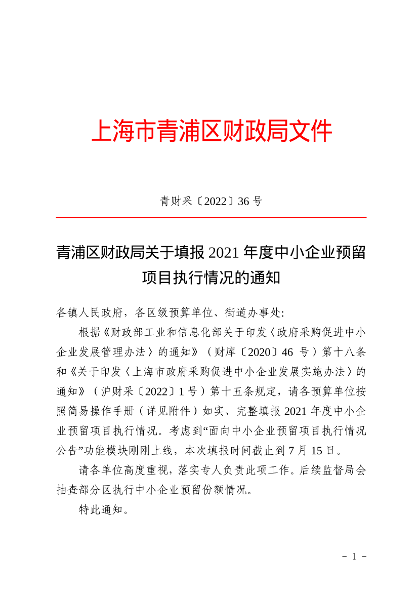 ??根據(jù)《財政部工業(yè)和信息化部關(guān)于印發(fā)〈政府采購促進中小企業(yè)發(fā)展管理辦法〉的通知》(財庫〔2020〕46號)第十八條和《關(guān)于印發(fā)〈上海市政府采購促進中小企業(yè)發(fā)展實施辦法〉的通知》(滬財采〔2022〕1號)第十五條規(guī)定,請各預算單位按照簡易操作手冊(詳見附件)如實、完整填報2021年度中小企業(yè)預留項目執(zhí)行情況。考慮到“面向中小企業(yè)預留項目執(zhí)行情況公告”功能模塊剛剛上線,本次填報時間截止到7月15日。