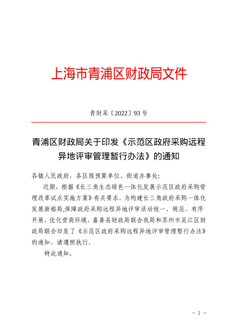 ??附件:上海市青浦區(qū)財(cái)政局蘇州吳江市財(cái)政局嘉善縣財(cái)政局關(guān)于印發(fā)《示范區(qū)政府采購(gòu)遠(yuǎn)程異地評(píng)審管理暫行辦法》的通知(善財(cái)發(fā)〔2022〕254號(hào))
