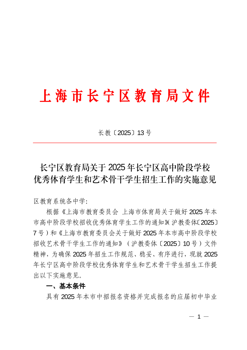 ??根據(jù)《上海市教育委員會 上海市體育局關于做好2025年本市高中階段學校招收優(yōu)秀體育學生工作的通知》(滬教委體〔2025〕7號)和《上海市教育委員會關于做好2025年本市高中階段學校招收藝術骨干學生工作的通知》(滬教委體〔2025〕10號)文件精神,為確保2025年招生工作規(guī)范、穩(wěn)妥、有序進行,現(xiàn)就2025年長寧區(qū)高中階段學校優(yōu)秀體育學生和藝術骨干學生招生工作提出以下實施意見。