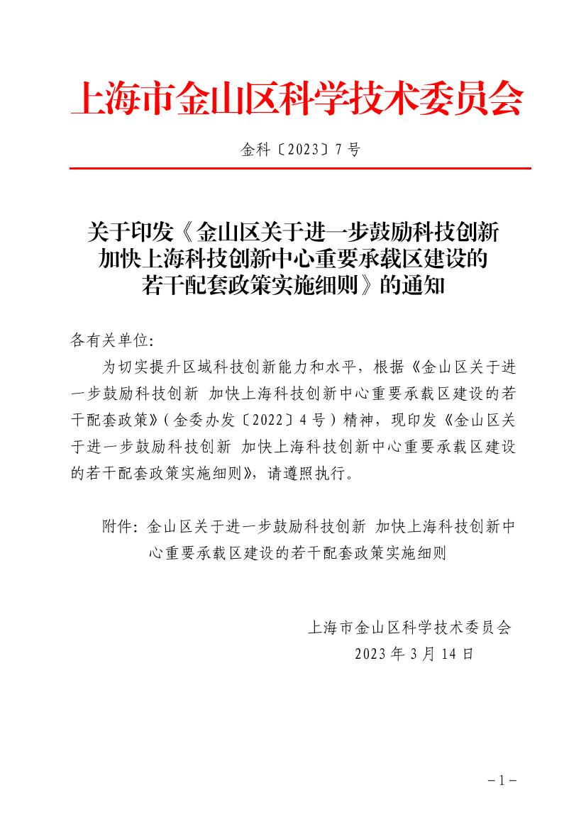 附件:金山區(qū)關(guān)于進(jìn)一步鼓勵(lì)科技創(chuàng)新 加快上??萍紕?chuàng)新中心重要承載區(qū)建設(shè)的若干配套政策實(shí)施細(xì)則