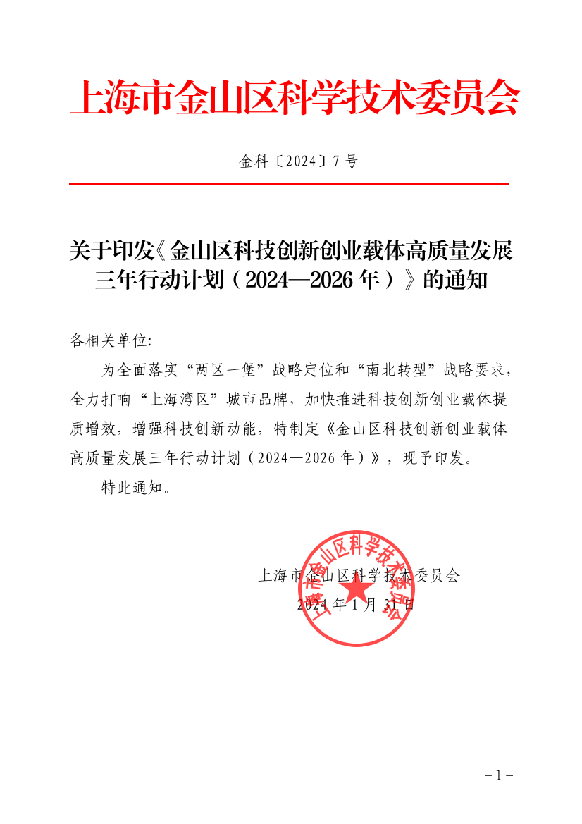 金山區(qū)科技創(chuàng)新創(chuàng)業(yè)載體高質(zhì)量發(fā)展三年行動(dòng)計(jì)劃(2024—2026年)