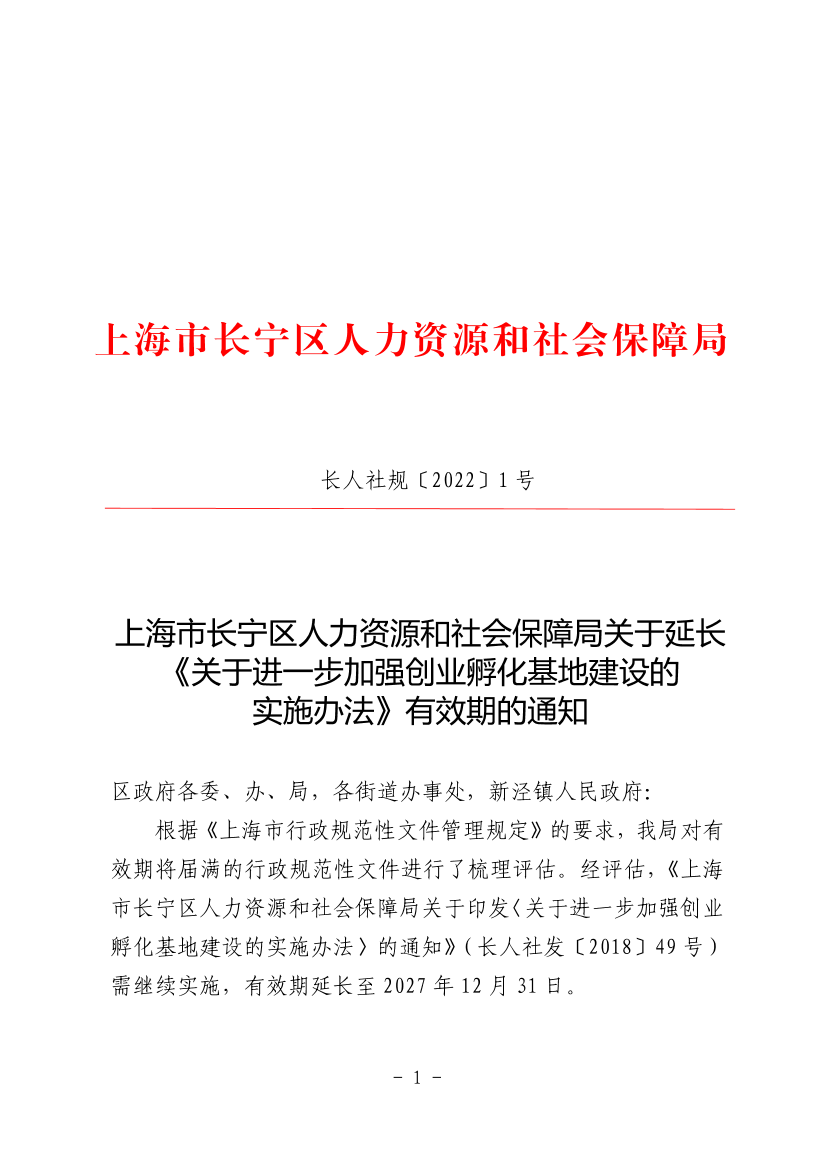 ??根據(jù)《上海市行政規(guī)范性文件管理規(guī)定》的要求,我局對(duì)有效期將屆滿的行政規(guī)范性文件進(jìn)行了梳理評(píng)估。經(jīng)評(píng)估,《上海市長寧區(qū)人力資源和社會(huì)保障局關(guān)于印發(fā)〈關(guān)于進(jìn)一步加強(qiáng)創(chuàng)業(yè)孵化基地建設(shè)的實(shí)施辦法〉的通知》(長人社發(fā)〔2018〕49號(hào))需繼續(xù)實(shí)施,有效期延長至2027年12月31日。