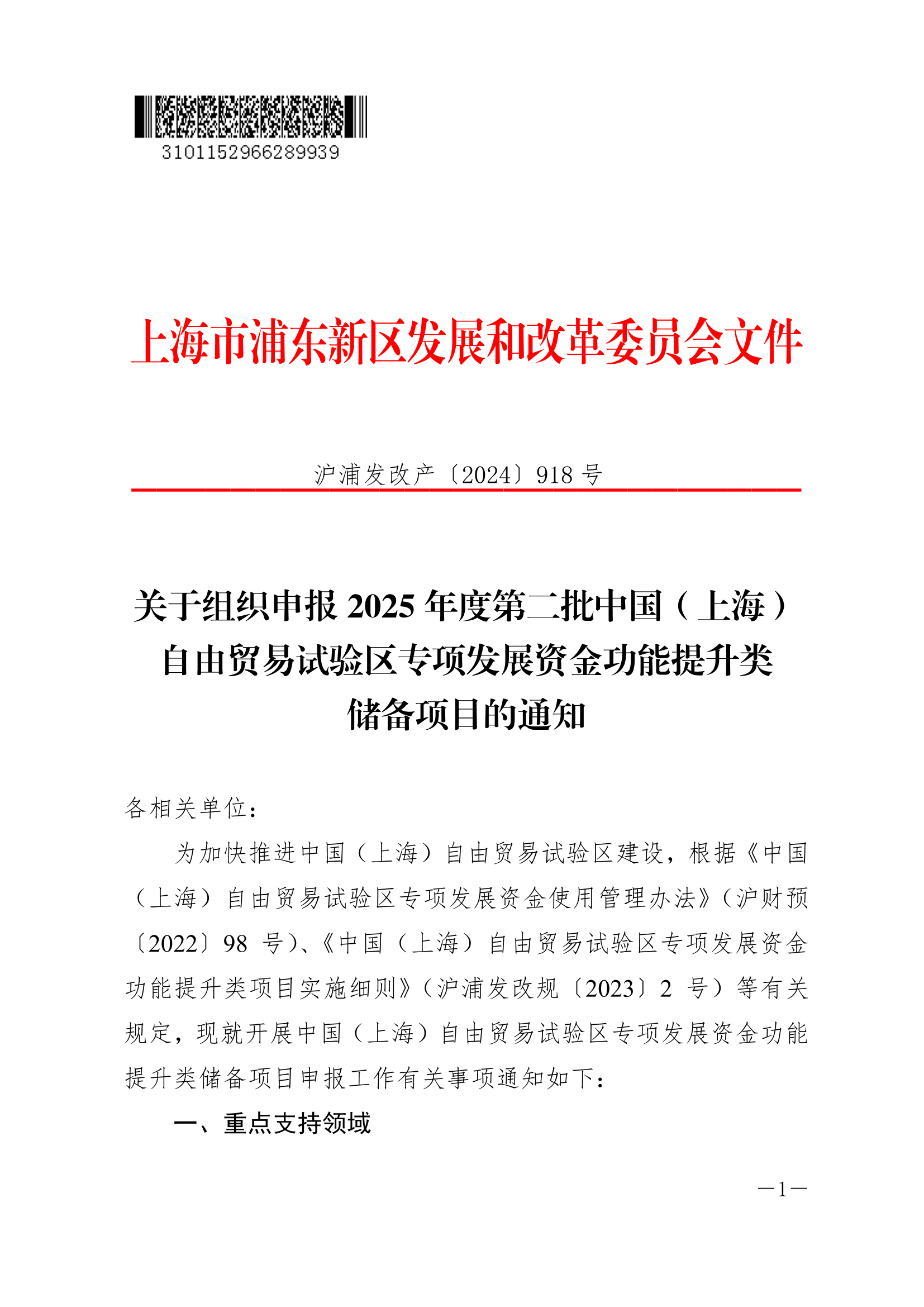 ??為加快推進(jìn)中國(guó)(上海)自由貿(mào)易試驗(yàn)區(qū)建設(shè),根據(jù)《中國(guó)(上海)自由貿(mào)易試驗(yàn)區(qū)專項(xiàng)發(fā)展資金使用管理辦法》(滬財(cái)預(yù)〔2022〕98號(hào))、《中國(guó)(上海)自由貿(mào)易試驗(yàn)區(qū)專項(xiàng)發(fā)展資金功能提升類項(xiàng)目實(shí)施細(xì)則》(滬浦發(fā)改規(guī)〔2023〕2號(hào))等有關(guān)規(guī)定,現(xiàn)就開展中國(guó)(上海)自由貿(mào)易試驗(yàn)區(qū)專項(xiàng)發(fā)展資金功能提升類儲(chǔ)備項(xiàng)目申報(bào)工作有關(guān)事項(xiàng)通知如下: