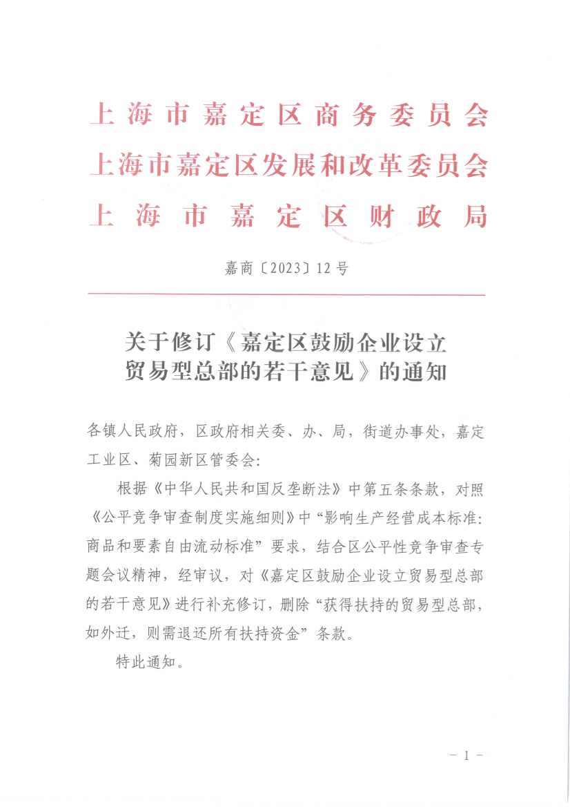 關于修訂《嘉定區(qū)鼓勵企業(yè)設立貿易型總部的若干意見》的通知