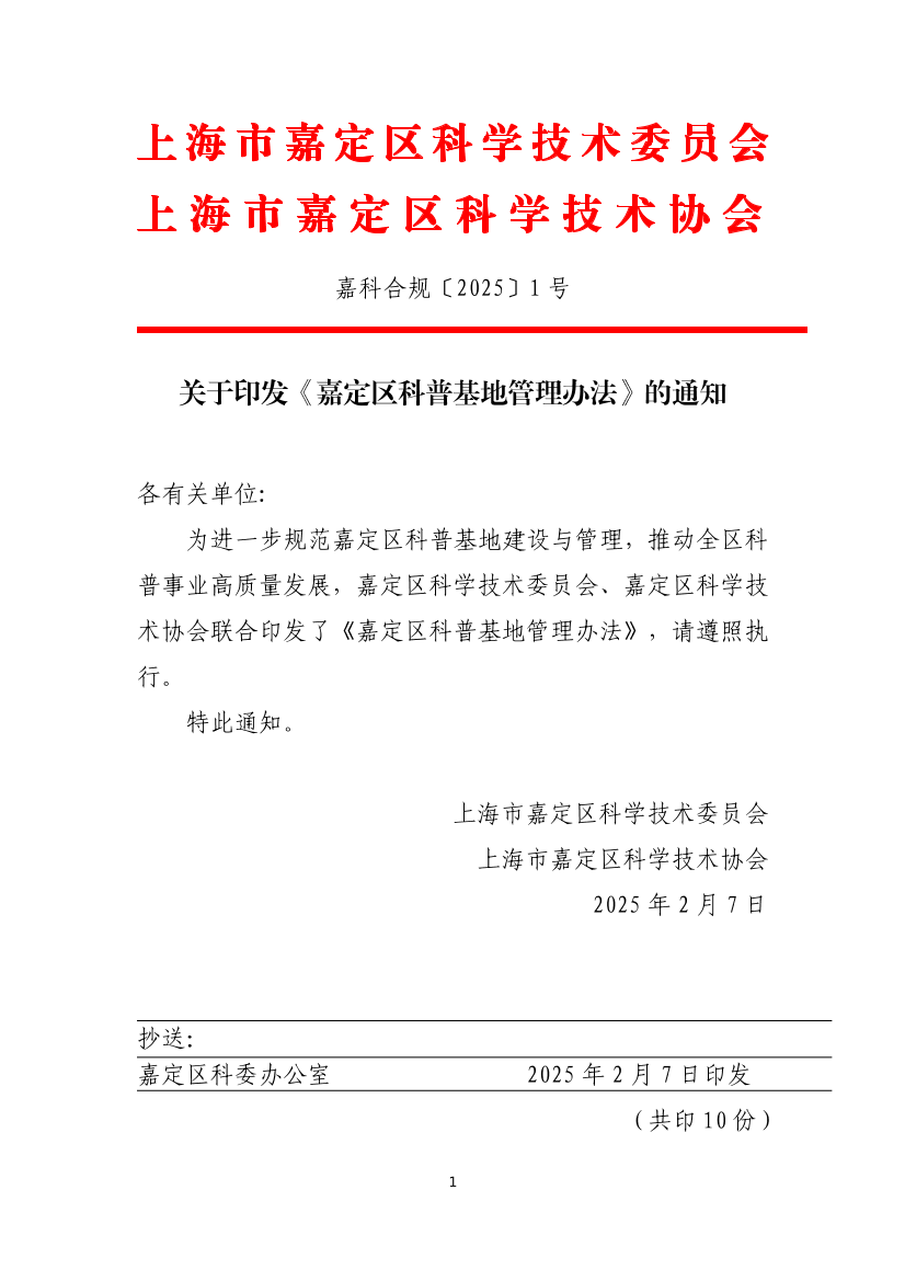 ??為進一步規(guī)范嘉定區(qū)科普基地建設與管理,推動全區(qū)科普事業(yè)高質(zhì)量發(fā)展,嘉定區(qū)科學技術委員會、嘉定區(qū)科學技術協(xié)會聯(lián)合印發(fā)了《嘉定區(qū)科普基地管理辦法》,請遵照執(zhí)行。