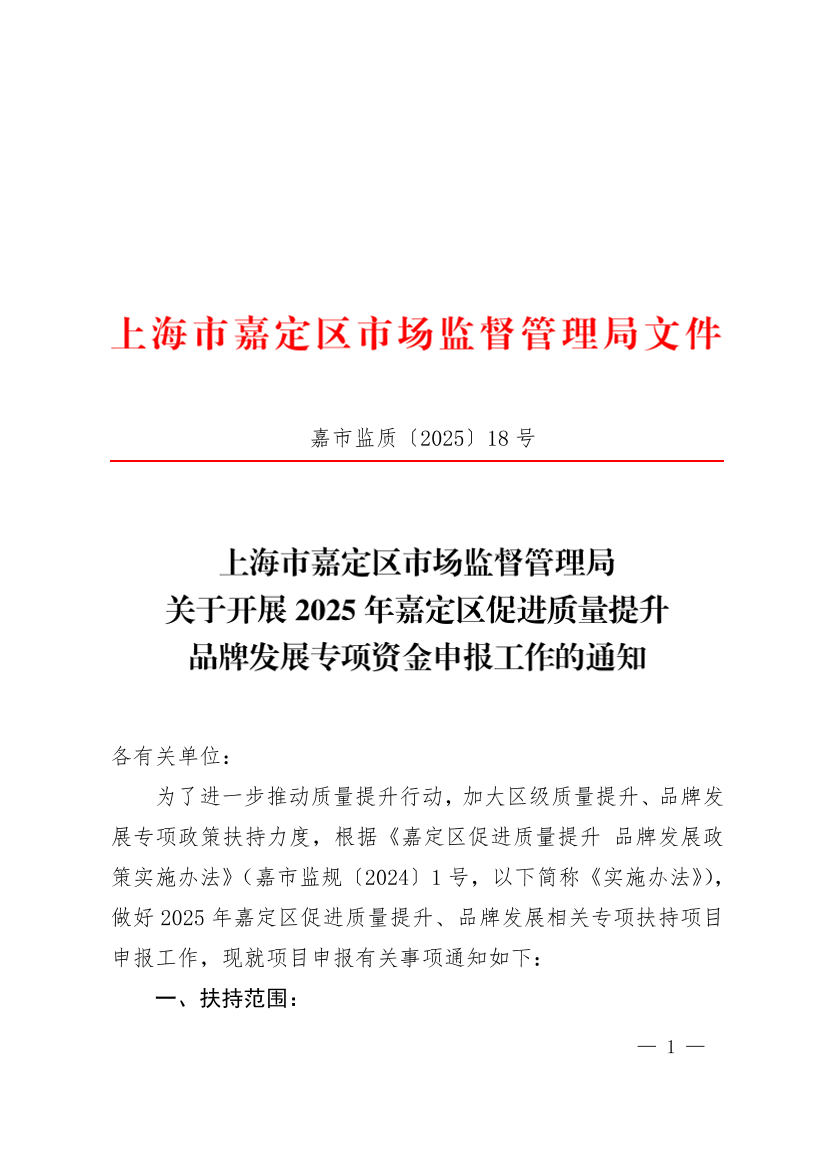 ??為了進(jìn)一步推動(dòng)質(zhì)量提升行動(dòng),加大區(qū)級(jí)質(zhì)量提升、品牌發(fā)展專項(xiàng)政策扶持力度,根據(jù)《嘉定區(qū)促進(jìn)質(zhì)量提升 品牌發(fā)展政策實(shí)施辦法》(嘉市監(jiān)規(guī)〔2024〕1號(hào),以下簡稱《實(shí)施辦法》),做好2025年嘉定區(qū)促進(jìn)質(zhì)量提升、品牌發(fā)展相關(guān)專項(xiàng)扶持項(xiàng)目申報(bào)工作,現(xiàn)就項(xiàng)目申報(bào)有關(guān)事項(xiàng)通知如下: