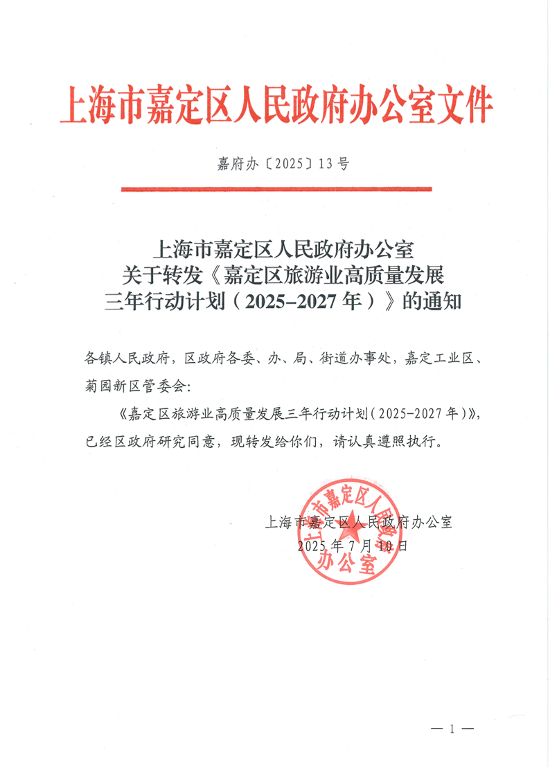 ??《嘉定區(qū)旅游業(yè)高質(zhì)量發(fā)展三年行動計劃(2025-2027年)》,已經(jīng)區(qū)政府研究同意,現(xiàn)轉(zhuǎn)發(fā)給你們,請認(rèn)真遵照執(zhí)行。