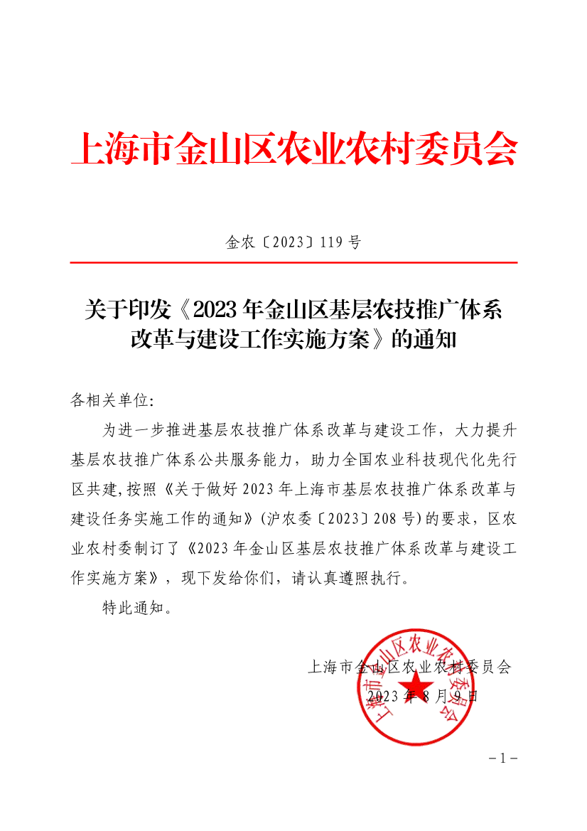 ??為進(jìn)一步推進(jìn)基層農(nóng)技推廣體系改革與建設(shè)工作,大力提升基層農(nóng)技推廣體系公共服務(wù)能力,助力全國(guó)農(nóng)業(yè)科技現(xiàn)代化先行區(qū)共建,按照《關(guān)于做好2023年上海市基層農(nóng)技推廣體系改革與建設(shè)任務(wù)實(shí)施工作的通知》(滬農(nóng)委〔2023〕208號(hào))的要求,區(qū)農(nóng)業(yè)農(nóng)村委制訂了《2023年金山區(qū)基層農(nóng)技推廣體系改革與建設(shè)工作實(shí)施方案》,現(xiàn)下發(fā)給你們,請(qǐng)認(rèn)真遵照?qǐng)?zhí)行。