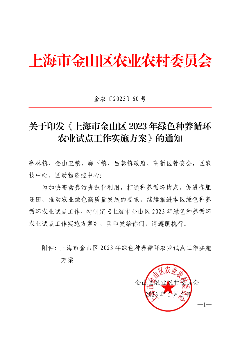 ??為加快畜禽糞污資源化利用,打通種養(yǎng)循環(huán)堵點,促進糞肥還田,推動農(nóng)業(yè)綠色高質(zhì)量發(fā)展的要求,繼續(xù)推進本區(qū)綠色種養(yǎng)循環(huán)農(nóng)業(yè)試點工作,特制定《上海市金山區(qū)2023年綠色種養(yǎng)循環(huán)農(nóng)業(yè)試點工作實施方案》,現(xiàn)印發(fā)給你們,請遵照執(zhí)行。
