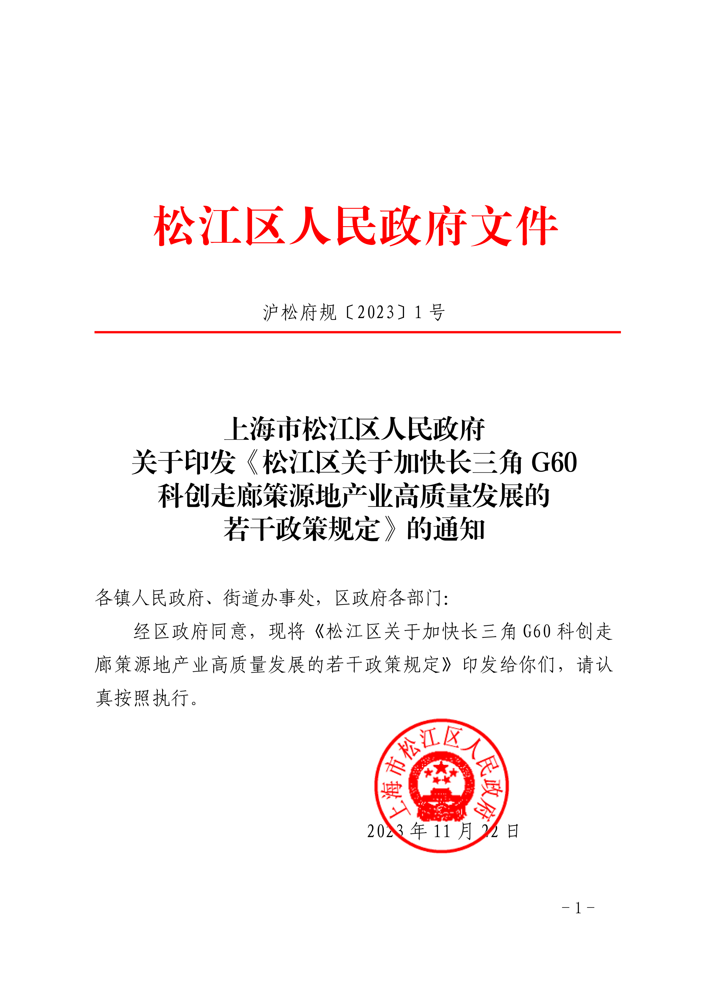 關(guān)于印發(fā)《松江區(qū)關(guān)于加快長三角G60科創(chuàng)走廊策源地產(chǎn)業(yè)高質(zhì)量發(fā)展的若干政策規(guī)定》的通知