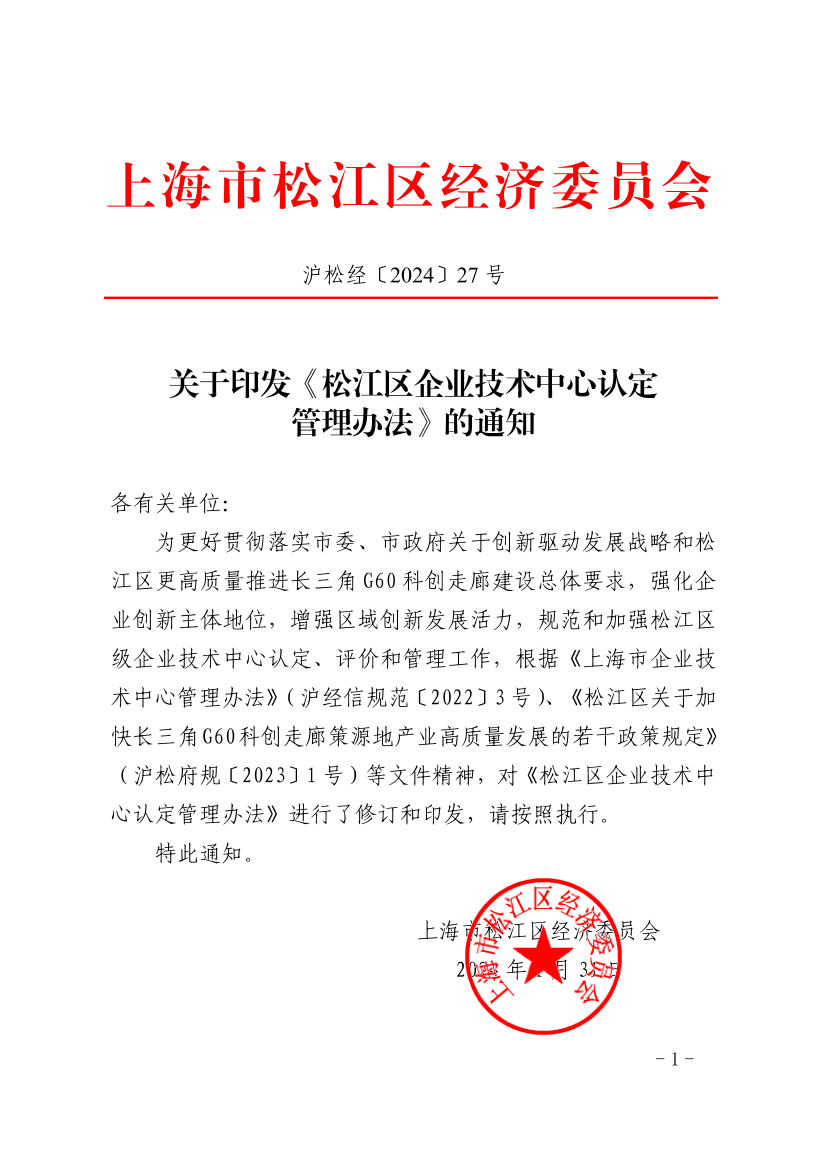 關(guān)于印發(fā)《松江區(qū)企業(yè)技術(shù)中心認(rèn)定管理辦法》的通知
