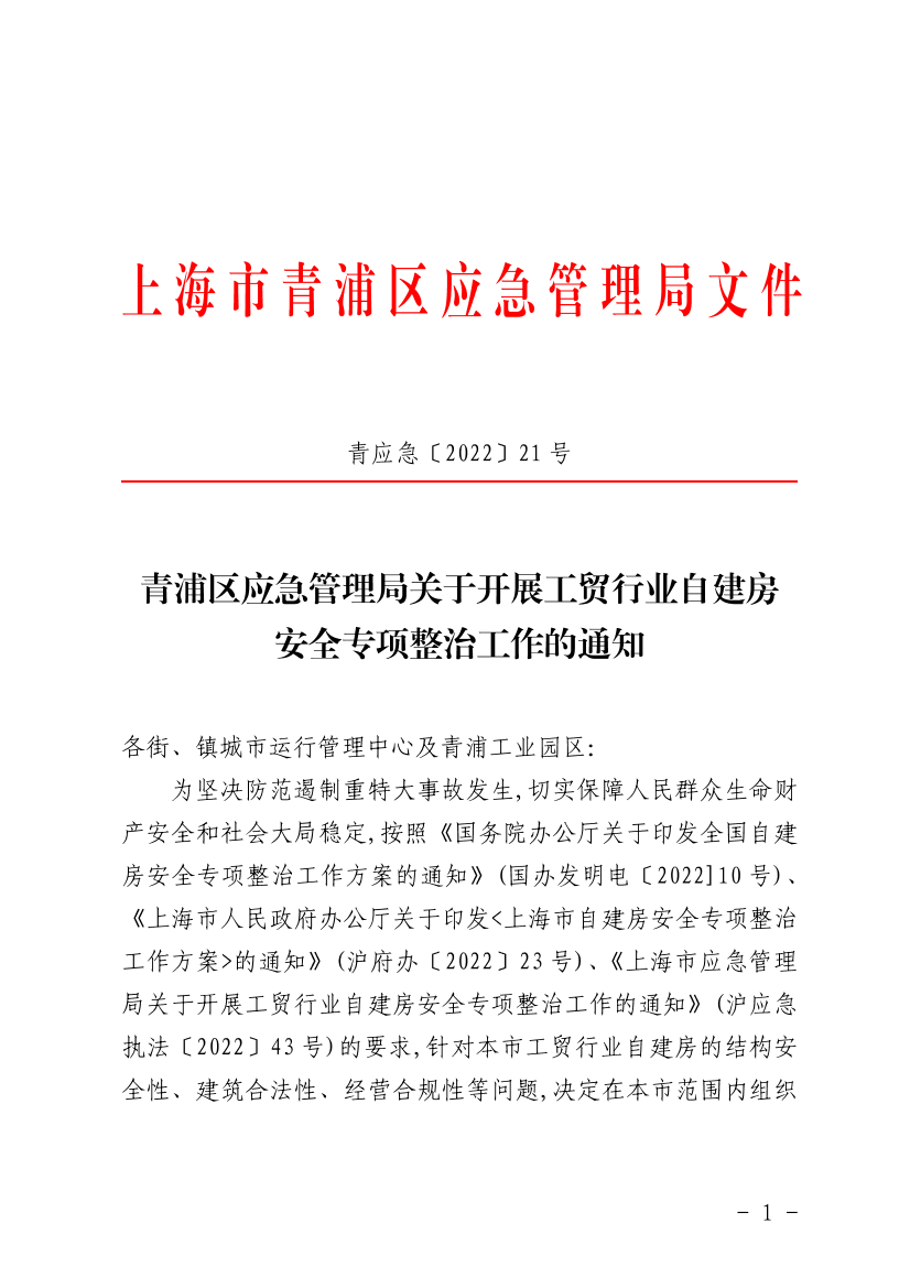 ??為堅(jiān)決防范遏制重特大事故發(fā)生,切實(shí)保障人民群眾生命財(cái)產(chǎn)安全和社會(huì)大局穩(wěn)定,按照《國務(wù)院辦公廳關(guān)于印發(fā)全國自建房安全專項(xiàng)整治工作方案的通知》(國辦發(fā)明電〔2022]10號(hào))、《上海市人民政府辦公廳關(guān)于印發(fā)<上海市自建房安全專項(xiàng)整治工作方案>的通知》(滬府辦〔2022〕23號(hào))、《上海市應(yīng)急管理局關(guān)于開展工貿(mào)行業(yè)自建房安全專項(xiàng)整治工作的通知》(滬應(yīng)急執(zhí)法〔2022〕43號(hào))的要求,針對(duì)本市工貿(mào)行業(yè)自建房的結(jié)構(gòu)安全性、建筑合法性、經(jīng)營合規(guī)性等問題,決定在本市范圍內(nèi)組織開展工貿(mào)行業(yè)自建房安全專項(xiàng)整治?,F(xiàn)結(jié)合我區(qū)實(shí)際,制定青浦區(qū)應(yīng)急管理局工貿(mào)行業(yè)自建房安全專項(xiàng)整治工作方案?,F(xiàn)將有關(guān)事項(xiàng)通知如下。