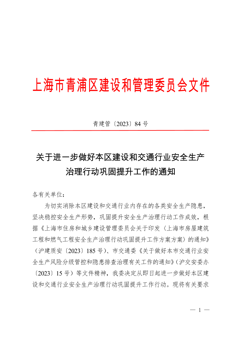 ??為切實(shí)消除本區(qū)建設(shè)和交通行業(yè)內(nèi)存在的各類安全生產(chǎn)隱患,堅(jiān)決穩(wěn)控安全生產(chǎn)形勢,鞏固提升安全生產(chǎn)治理行動(dòng)工作成效,根據(jù)《上海市住房和城鄉(xiāng)建設(shè)管理委員會(huì)關(guān)于印發(fā)〈上海市房屋建筑工程和燃?xì)夤こ贪踩a(chǎn)治理行動(dòng)鞏固提升工作方案方案〉的通知》(滬建質(zhì)安〔2023〕185號(hào))、市交通委《關(guān)于做好本市交通行業(yè)安全生產(chǎn)風(fēng)險(xiǎn)分級(jí)管控和隱患排查治理有關(guān)工作的通知》(滬交安委辦〔2023〕15號(hào))等文件精神,我委決定從即日起進(jìn)一步做好本區(qū)建設(shè)和交通行業(yè)安全生產(chǎn)治理行動(dòng)鞏固提升工作行動(dòng)?,F(xiàn)將有關(guān)要求通知如下: