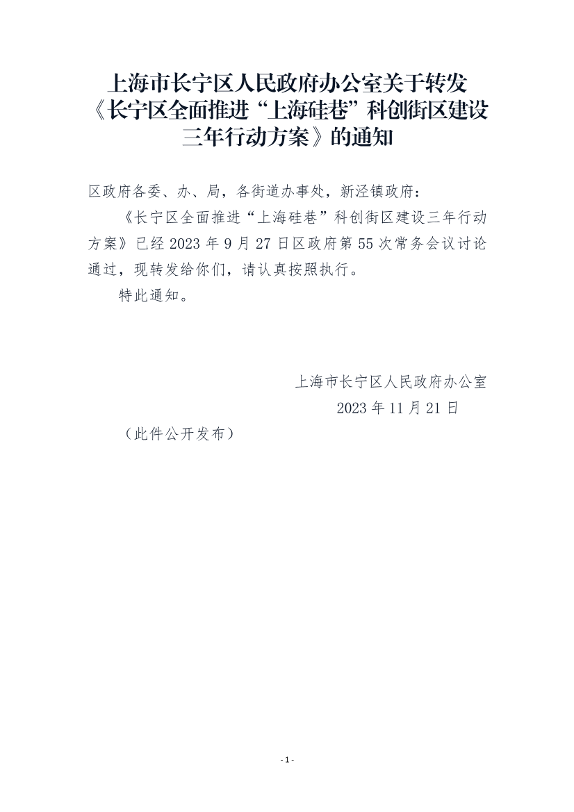 上海市長(zhǎng)寧區(qū)人民政府辦公室關(guān)于轉(zhuǎn)發(fā)《長(zhǎng)寧區(qū)全面推進(jìn)“上海硅巷”科創(chuàng)街區(qū)建設(shè)三年行動(dòng)方案》的通知