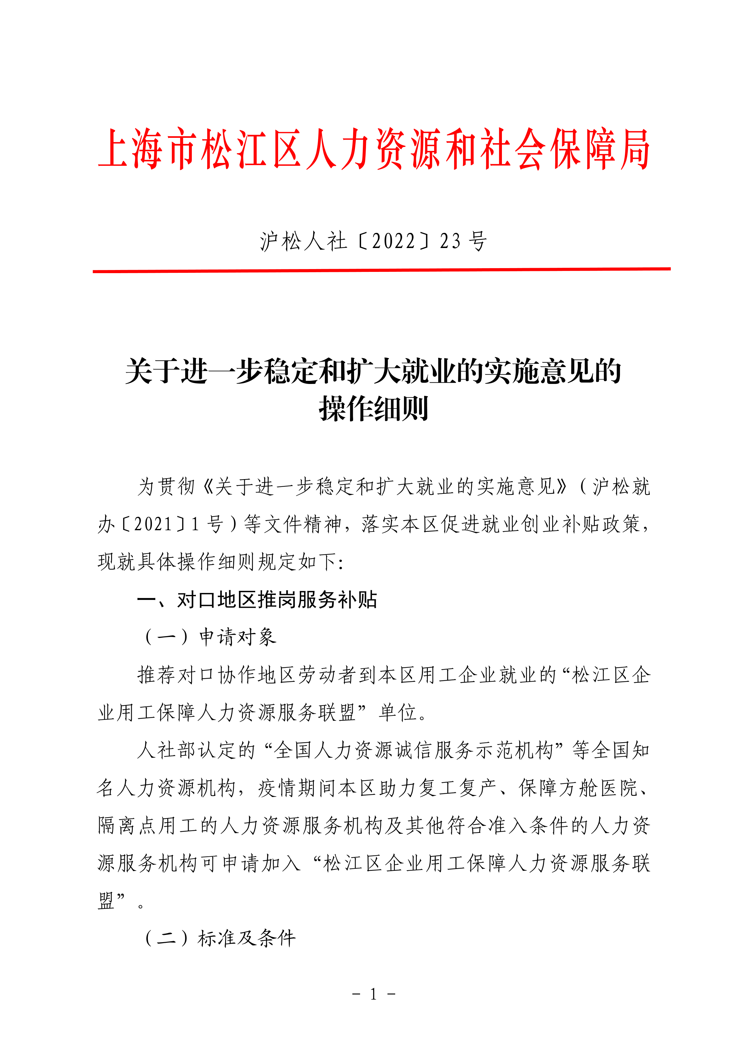??為貫徹《關(guān)于進(jìn)一步穩(wěn)定和擴(kuò)大就業(yè)的實(shí)施意見》(滬松就辦〔2021〕1號(hào))等文件精神,落實(shí)本區(qū)促進(jìn)就業(yè)創(chuàng)業(yè)補(bǔ)貼政策,現(xiàn)就具體操作細(xì)則規(guī)定如下: