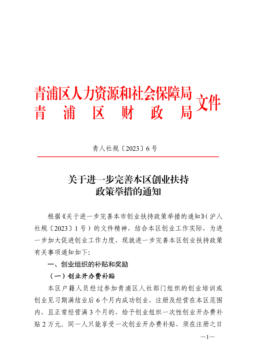 ??根據(jù)《關(guān)于進(jìn)一步完善本市創(chuàng)業(yè)扶持政策舉措的通知》(滬人社規(guī)〔2023〕1號(hào))的文件精神,結(jié)合本區(qū)創(chuàng)業(yè)工作實(shí)際,為進(jìn)一步加大促進(jìn)創(chuàng)業(yè)工作力度,現(xiàn)就進(jìn)一步完善本區(qū)創(chuàng)業(yè)扶持政策有關(guān)事項(xiàng)通知如下: