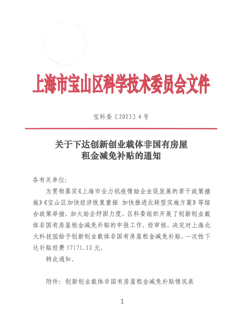 ??為貫徹落實(shí)《上海市全力抗疫情助企業(yè)促發(fā)展的若干政策措施》《寶山區(qū)加快經(jīng)濟(jì)恢復(fù)重振 加快推進(jìn)北轉(zhuǎn)型實(shí)施方案》等綜合政策舉措,加大助企紓困力度,區(qū)科委組織開展了創(chuàng)新創(chuàng)業(yè)載體非國有房屋租金減免補(bǔ)貼的申報(bào)工作。經(jīng)審核,決定對上海北大科技園給予創(chuàng)新創(chuàng)業(yè)載體非國有房屋租金減免補(bǔ)貼,一次性下達(dá)補(bǔ)貼經(jīng)費(fèi)57171.12元。
