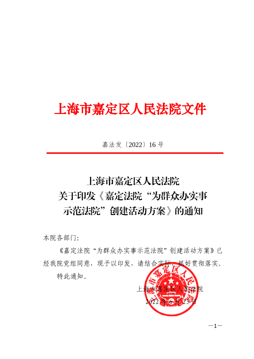 上海市嘉定區(qū)人民法院關(guān)于印發(fā)《嘉定法院“為群眾辦實(shí)事示范法院”創(chuàng)建活動(dòng)方案》的通知