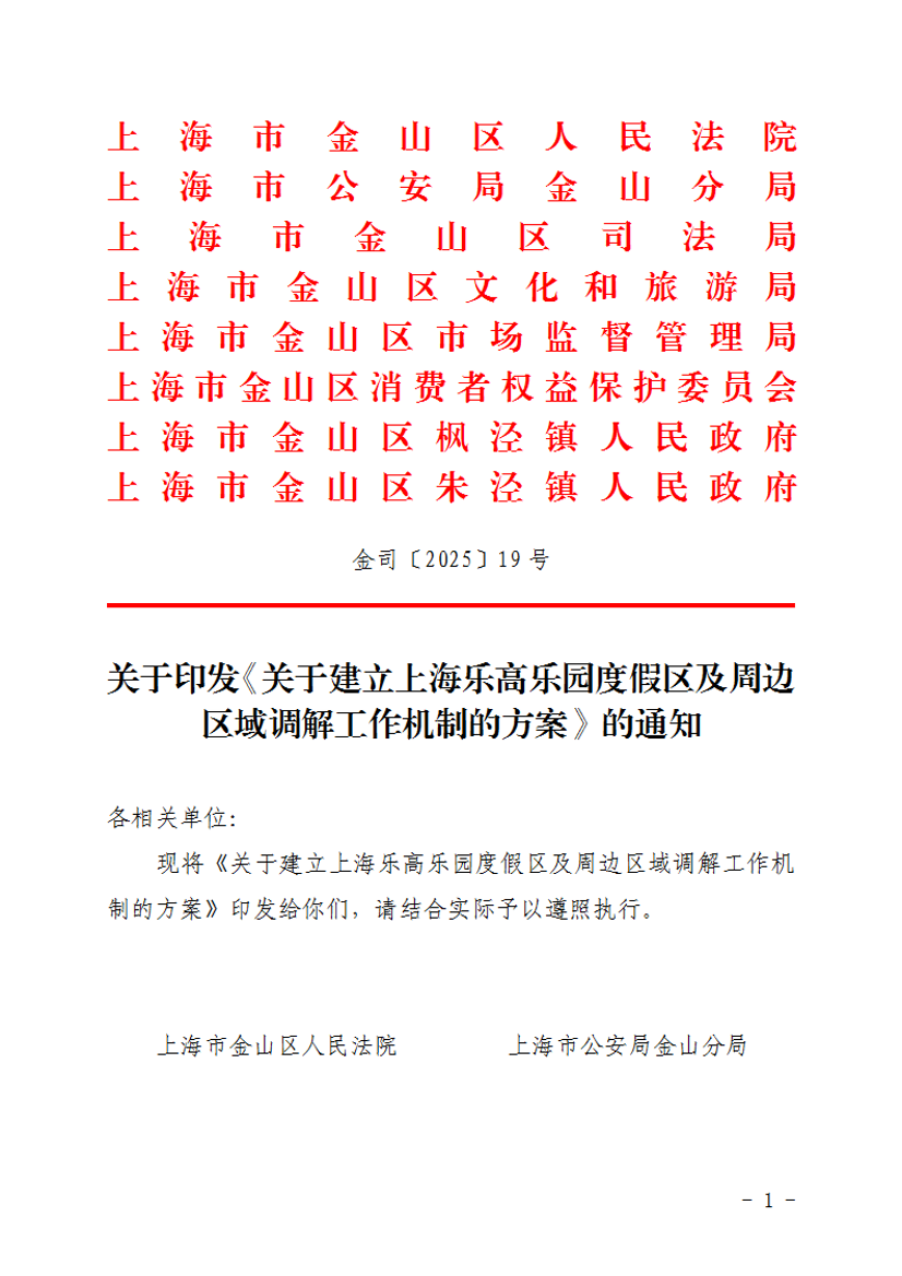 ??現將《關于建立上海樂高樂園度假區(qū)及周邊區(qū)域調解工作機制的方案》印發(fā)給你們,請結合實際予以遵照執(zhí)行。