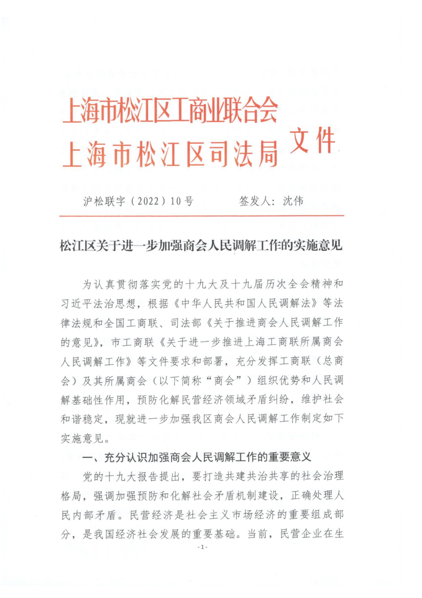 松江區(qū)關(guān)于進(jìn)一步加強(qiáng)商會(huì)人民調(diào)解工作的實(shí)施意見