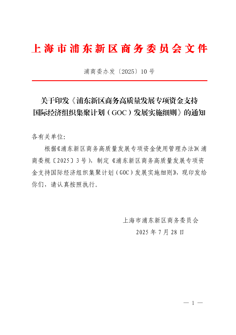 浦東新區(qū)商務(wù)高質(zhì)量發(fā)展專項資金支持國際經(jīng)濟組織集聚計劃(GOC)發(fā)展實施細(xì)則