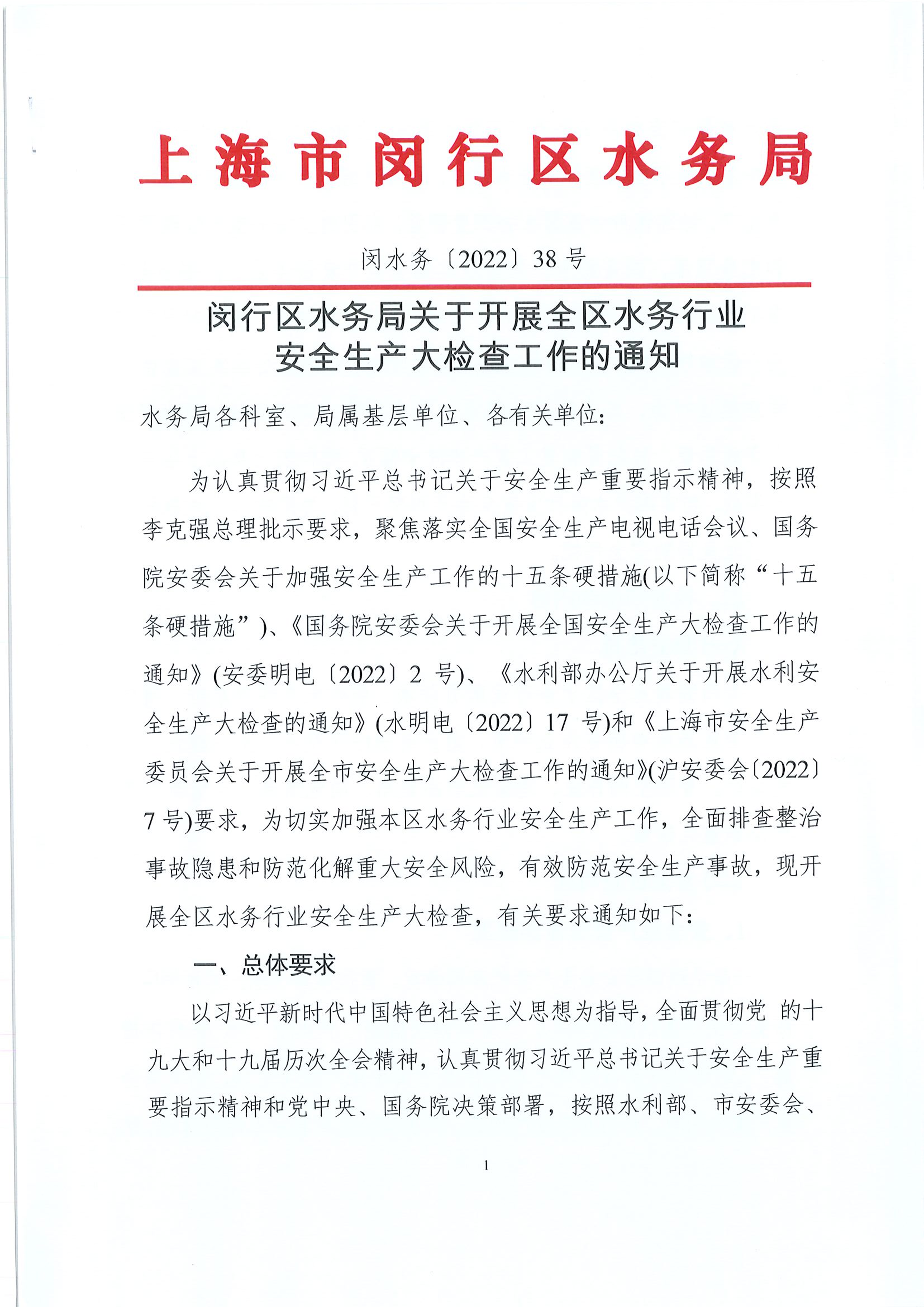 ??為認(rèn)真貫徹習(xí)近平總書記關(guān)于安全生產(chǎn)重要指示精神,按照 李克強(qiáng)總理批示要求,聚焦落實(shí)全國(guó)安全生產(chǎn)電視電話會(huì)議、國(guó)務(wù)院安委會(huì)關(guān)于加強(qiáng)安全生產(chǎn)工作的十五條硬措施(以下簡(jiǎn)稱“十五條硬措施”)、《國(guó)務(wù)院安委會(huì)關(guān)于開展全國(guó)安全生產(chǎn)大檢查工作的通知》(安委明電〔2022〕2 號(hào))、《水利部辦公廳關(guān)于開展水利安全生產(chǎn)大檢查的通知》(水明電〔2022〕17 號(hào))和《上海市安全生產(chǎn)委員會(huì)關(guān)于開展全市安全生產(chǎn)大檢查工作的通知》(滬安委會(huì)〔2022〕7號(hào))要求,為切實(shí)加強(qiáng)本區(qū)水務(wù)行業(yè)安全生產(chǎn)工作,全面排查整治事故隱患和防范化解重大安全風(fēng)險(xiǎn),有效防范安全生產(chǎn)事故,現(xiàn)開展全區(qū)水務(wù)行業(yè)安全生產(chǎn)大檢查,有關(guān)要求通知如下: