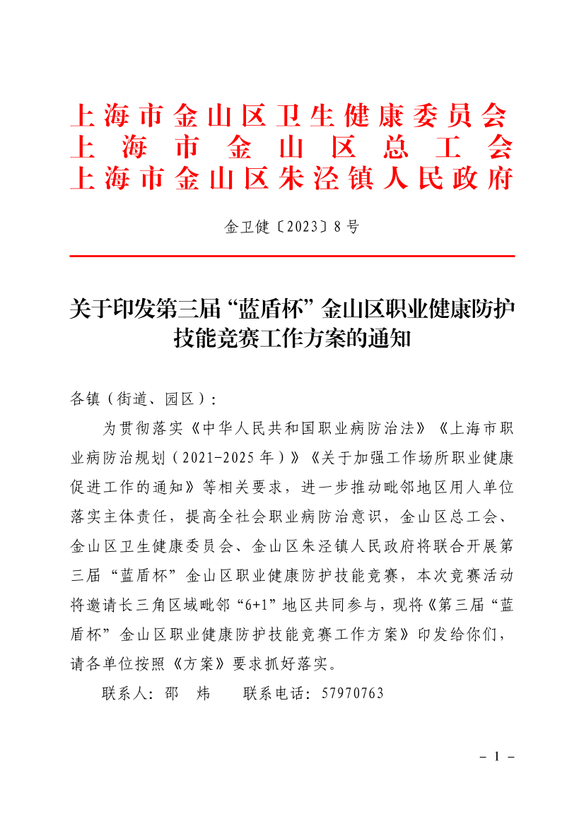 為貫徹落實(shí)《中華人民共和國(guó)職業(yè)病防治法》《上海市職業(yè)病防治規(guī)劃(2021-2025年)》《關(guān)于加強(qiáng)工作場(chǎng)所職業(yè)健康促進(jìn)工作的通知》等相關(guān)要求,進(jìn)一步推動(dòng)毗鄰地區(qū)用人單位落實(shí)主體責(zé)任,提高全社會(huì)職業(yè)病防治意識(shí),金山區(qū)總工會(huì)、金山區(qū)衛(wèi)生健康委員會(huì)、金山區(qū)朱涇鎮(zhèn)人民政府將聯(lián)合開(kāi)展第三屆“藍(lán)盾杯”金山區(qū)職業(yè)健康防護(hù)技能競(jìng)賽,本次競(jìng)賽活動(dòng)將邀請(qǐng)長(zhǎng)三角區(qū)域毗鄰“6+1”地區(qū)共同參與,現(xiàn)將《第三屆“藍(lán)盾杯”金山區(qū)職業(yè)健康防護(hù)技能競(jìng)賽工作方案》印發(fā)給你們,請(qǐng)各單位按照《方案》要求抓好落實(shí)。