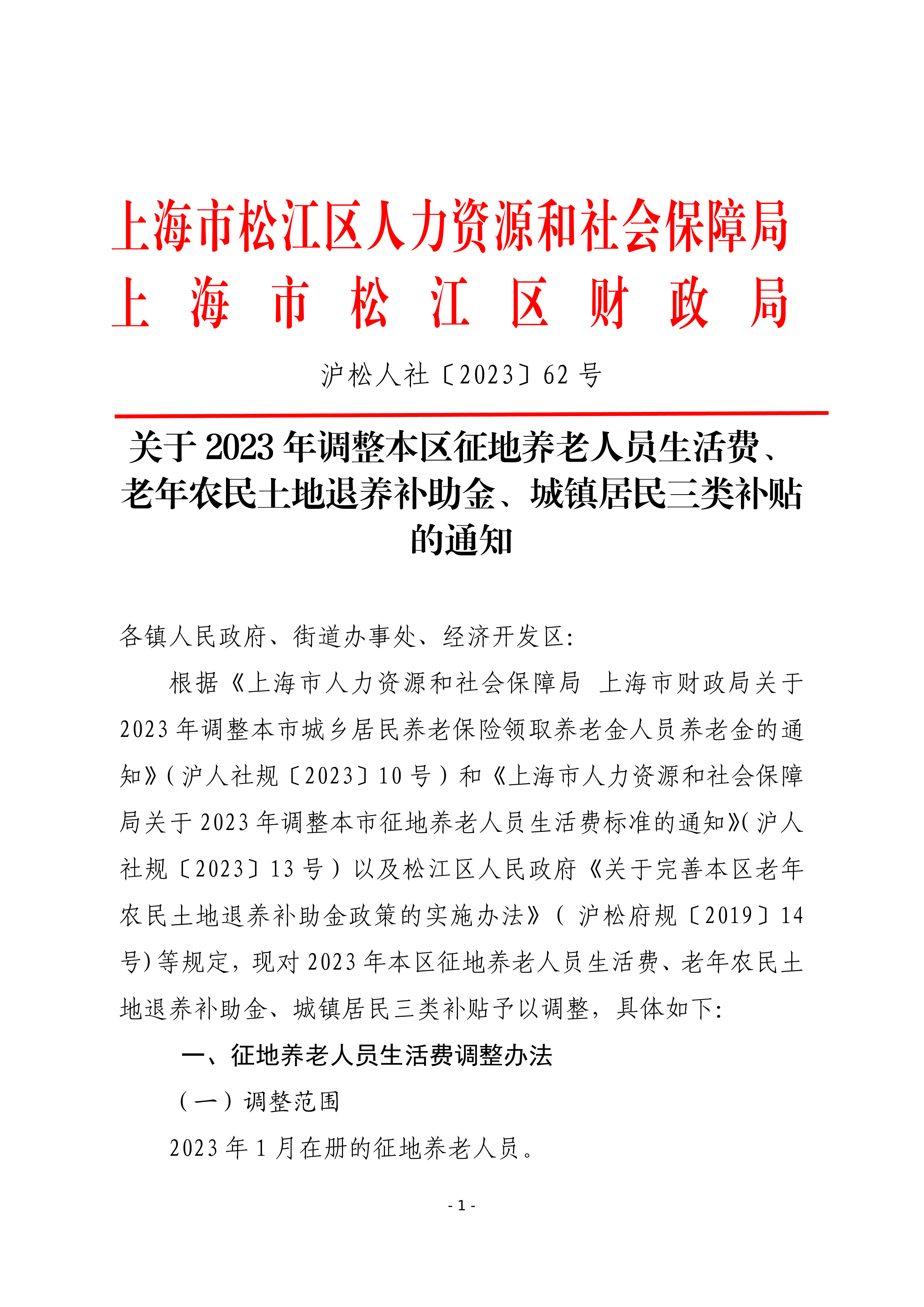 ??根據(jù)《上海市人力資源和社會(huì)保障局 上海市財(cái)政局關(guān)于2023年調(diào)整本市城鄉(xiāng)居民養(yǎng)老保險(xiǎn)領(lǐng)取養(yǎng)老金人員養(yǎng)老金的通知》(滬人社規(guī)〔2023〕10號(hào))和《上海市人力資源和社會(huì)保障局關(guān)于2023年調(diào)整本市征地養(yǎng)老人員生活費(fèi)標(biāo)準(zhǔn)的通知》(滬人社規(guī)〔2023〕13號(hào))以及松江區(qū)人民政府《關(guān)于完善本區(qū)老年農(nóng)民土地退養(yǎng)補(bǔ)助金政策的實(shí)施辦法》( 滬松府規(guī)〔2019〕14號(hào))等規(guī)定,現(xiàn)對(duì)2023年本區(qū)征地養(yǎng)老人員生活費(fèi)、老年農(nóng)民土地退養(yǎng)補(bǔ)助金、城鎮(zhèn)居民三類補(bǔ)貼予以調(diào)整,具體如下: