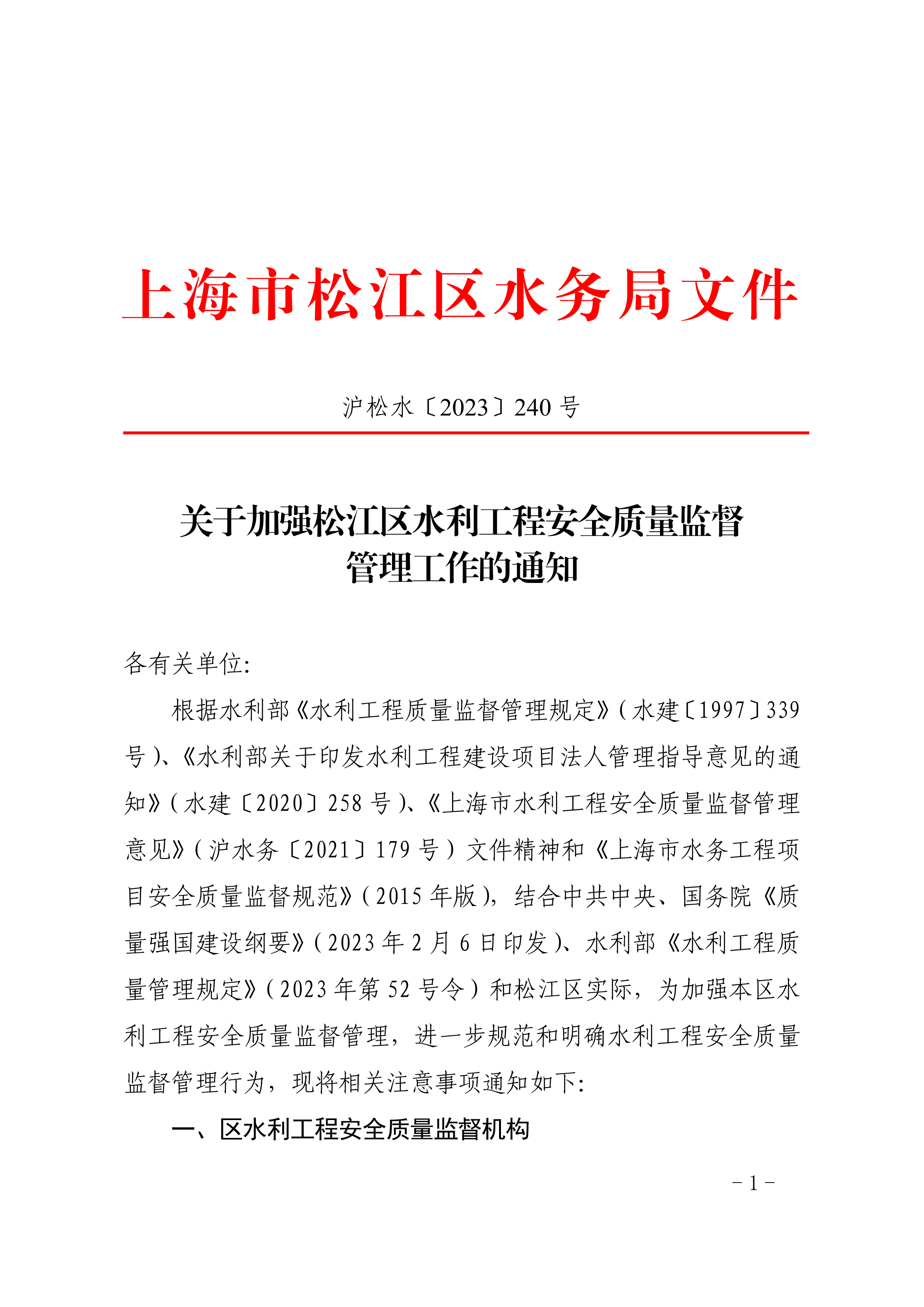 關(guān)于加強松江區(qū)水利工程安全質(zhì)量監(jiān)督管理工作的通知