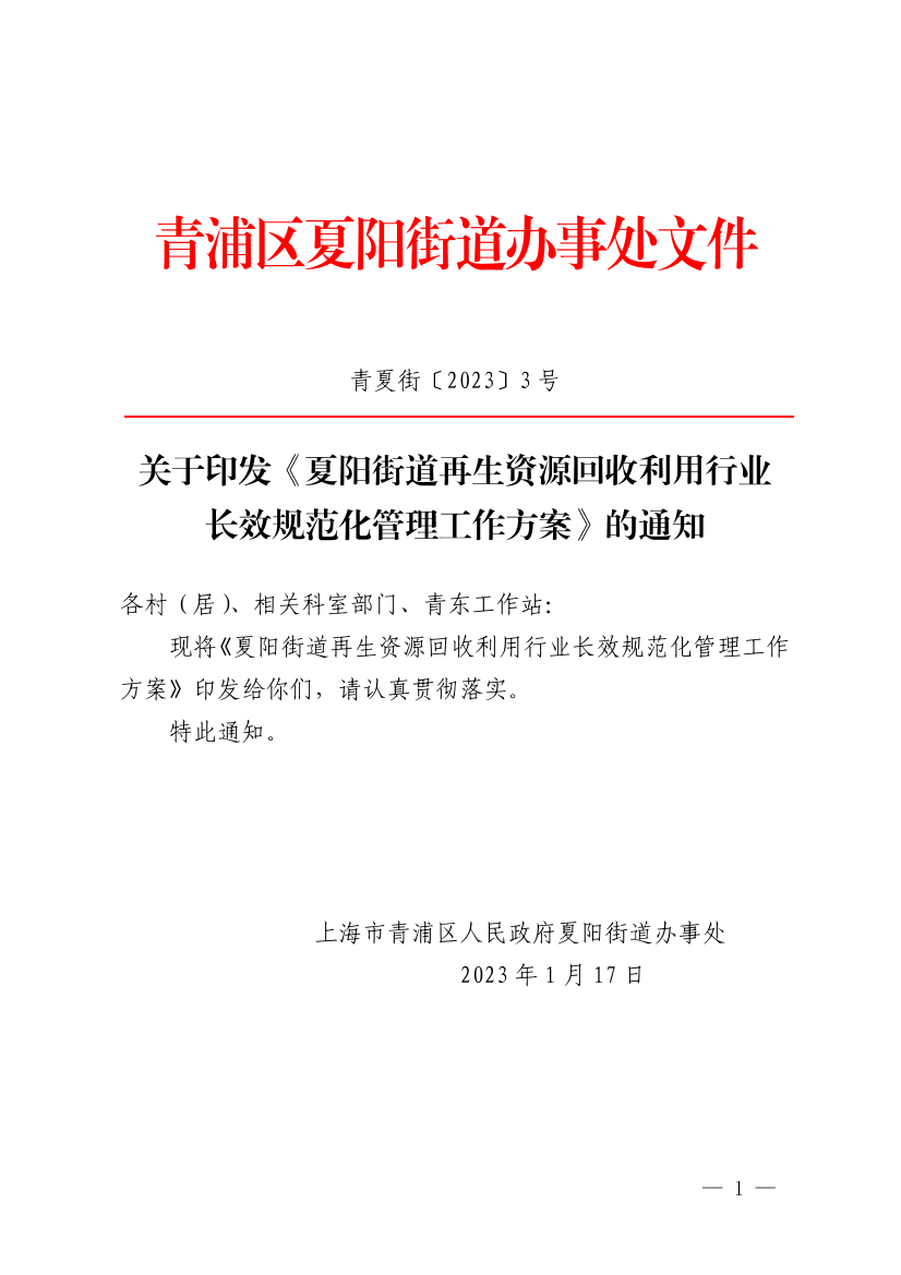 現(xiàn)將《夏陽(yáng)街道再生資源回收利用行業(yè)長(zhǎng)效規(guī)范化管理工作方案》印發(fā)給你們,請(qǐng)認(rèn)真貫徹落實(shí)。